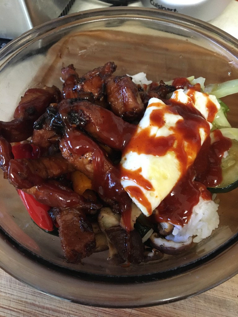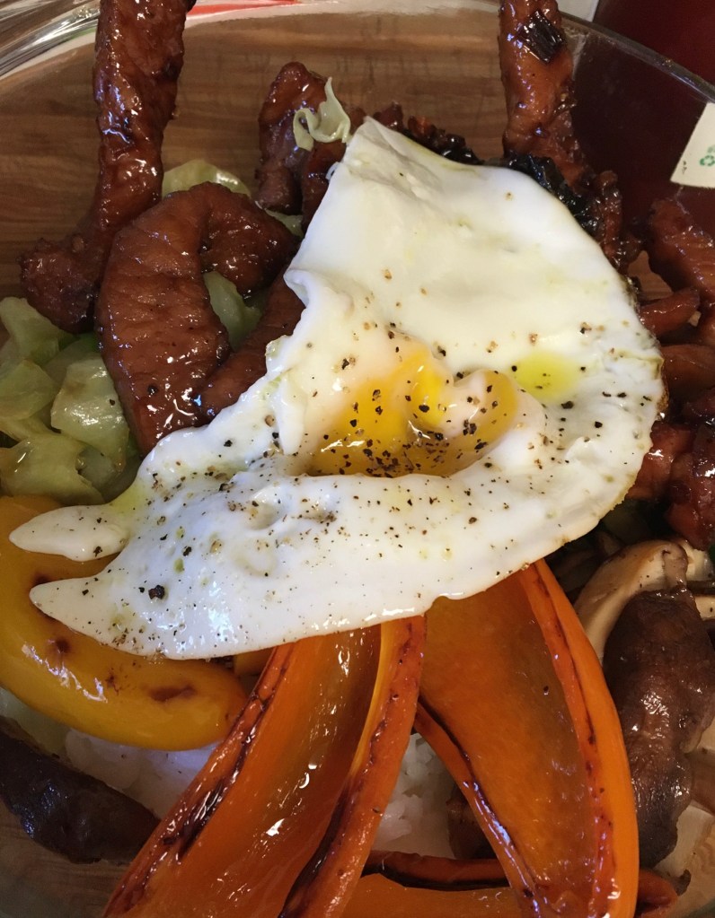 Essentially, this is a rice bowl. The ingredients are prepared separately and then placed into the bowl. It’s okay for it to be served room temperature. I use a medium skillet to stir-fry each vegetable, one after the other, then stir-fry the meat in the same skillet. I fry the egg in a smaller saute pan at the very last, trying to keep it intact as the runny egg should be considered part of the sauce.