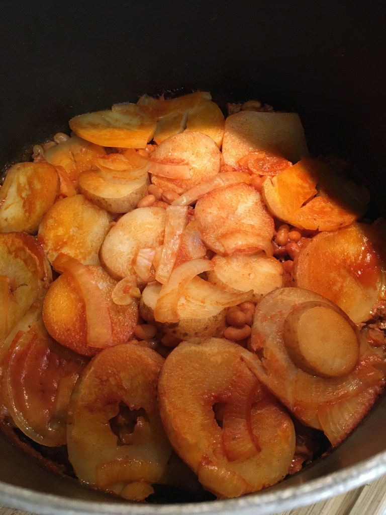Preheat oven to 350 degrees F. Prepare a 2-quart casserole dish (I use my Dutch Oven) with non-stick spray or grease. Place a layer of sliced potatoes, salt and pepper, then a sprinkle of sliced onions. Add ground beef (just sprinkle it around on top), then the Pork and Beans. Add another layer of potatoes, salt and pepper, and sliced onions. Pour tomato juice over the top. Bake at 350 degrees for two hours. Yield: 4 servings