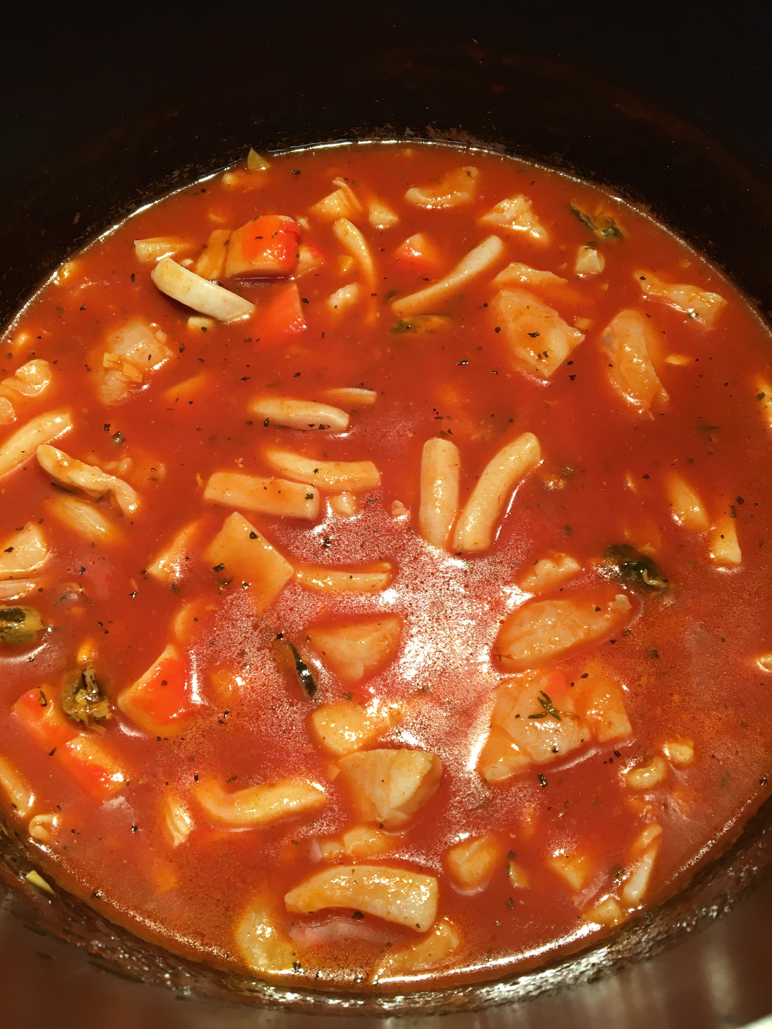 Swazz some olive oil around in a large pot. Stir in garlic and spices and stir fry until garlic is cooked, but not browned. Stir in wine and let it simmer for awhile. Stir in the tomato puree. Stir in enough stock to give a consistency that you like. Don’t forget the fish will lose some of its water into the pot and make everything a bit runnier than now, so a bit thicker than you like will be best. Let the sauce simmer for ten minutes. Stir in shellfish and white fish. Squeeze lemon juice into the pot. Remove from heat once the fish is cooked through. Serve with crusty bread. Serves 3-4.