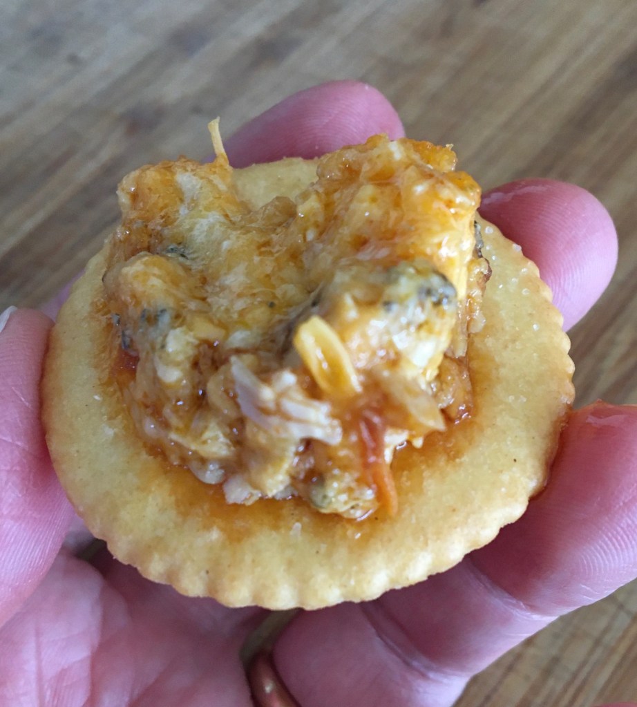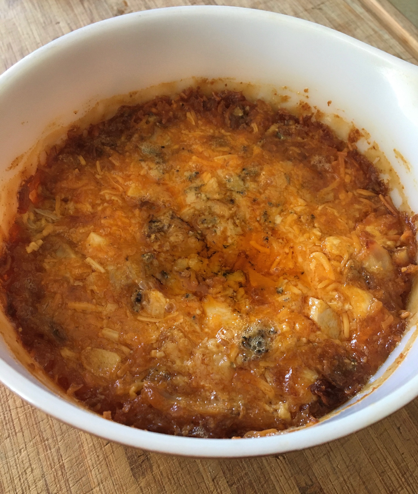 Notes: My friend Sandie gave me the recipe with some of the ingredients in very specific amounts. For example, it called for 2 cups shredded sharp cheese, 1/2 cup Frank’s, and one bottle of bleu cheese salad dressing, along with the other non-specific ingredients. Since I always make my own bleu cheese dressing, in this recipe I use mayonnaise and lots and lots of bleu cheese crumbles. Adding plain Greek yogurt, sour cream, or buttermilk in place of some of the mayonnaise would probably work well. This dip tends to separate into oils and solids because of the oil in the cheddar cheese and mayo. I don’t know how to make it not do that. I try to ladle some of the oil off before serving.