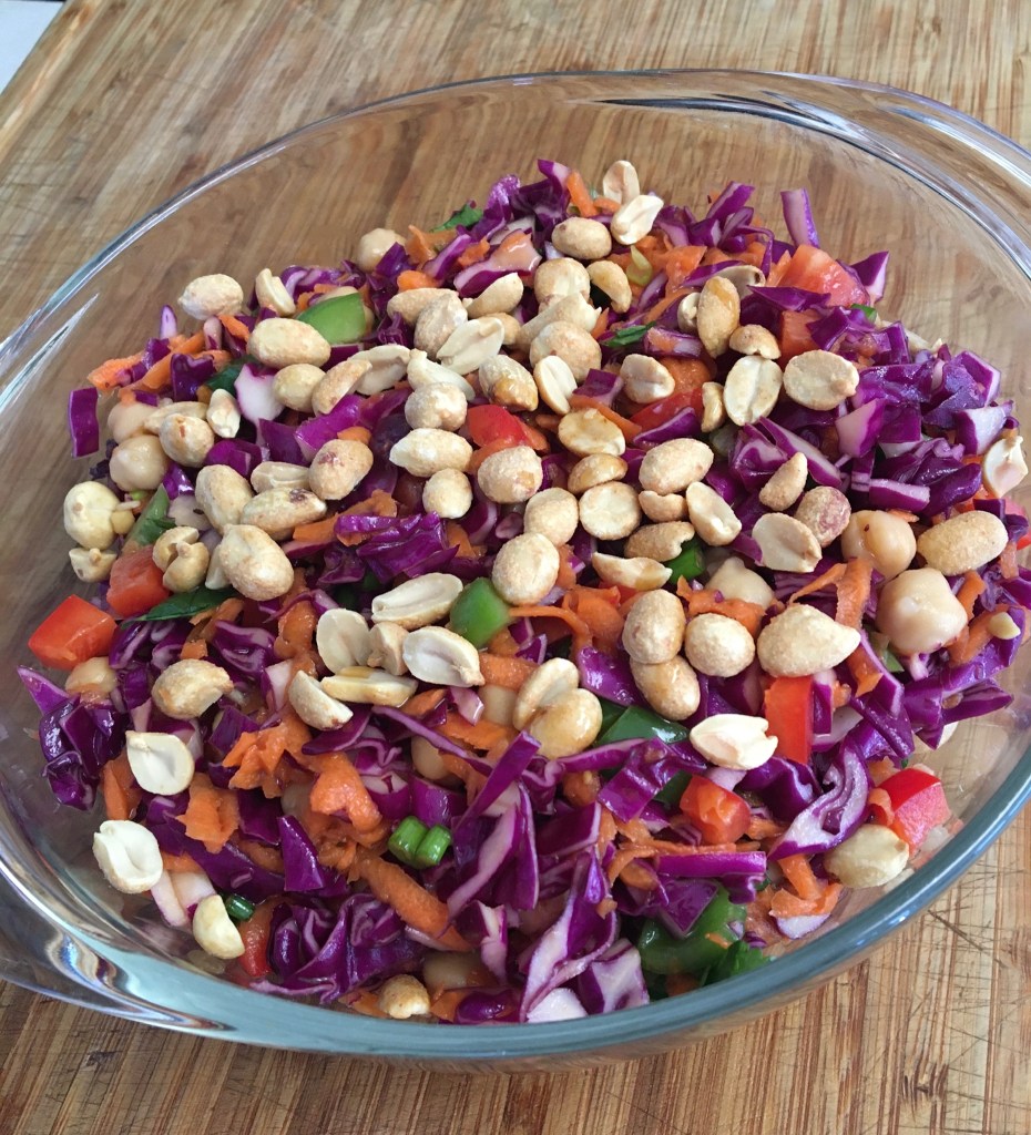 Notes: I have used Napa cabbage, green cabbage, all colors of bell pepper. I use dry-roasted peanuts. I think last time I made this I used raspberry vinegar because I ran out of rice vinegar. Instead of garbanzo beans, Jenn calls for edamame. I barely know what that is, so I can’t tell you yay or nay. I use canned garbanzo beans and usually make hummus with the unused half-can. The recipe is very forgiving, do what you like. As I write this, tonight I’m going to serve it with Sweet and Sour Chicken in Acorn Squash Bowls. Again, the flavors of this chopped salad are really bright.
