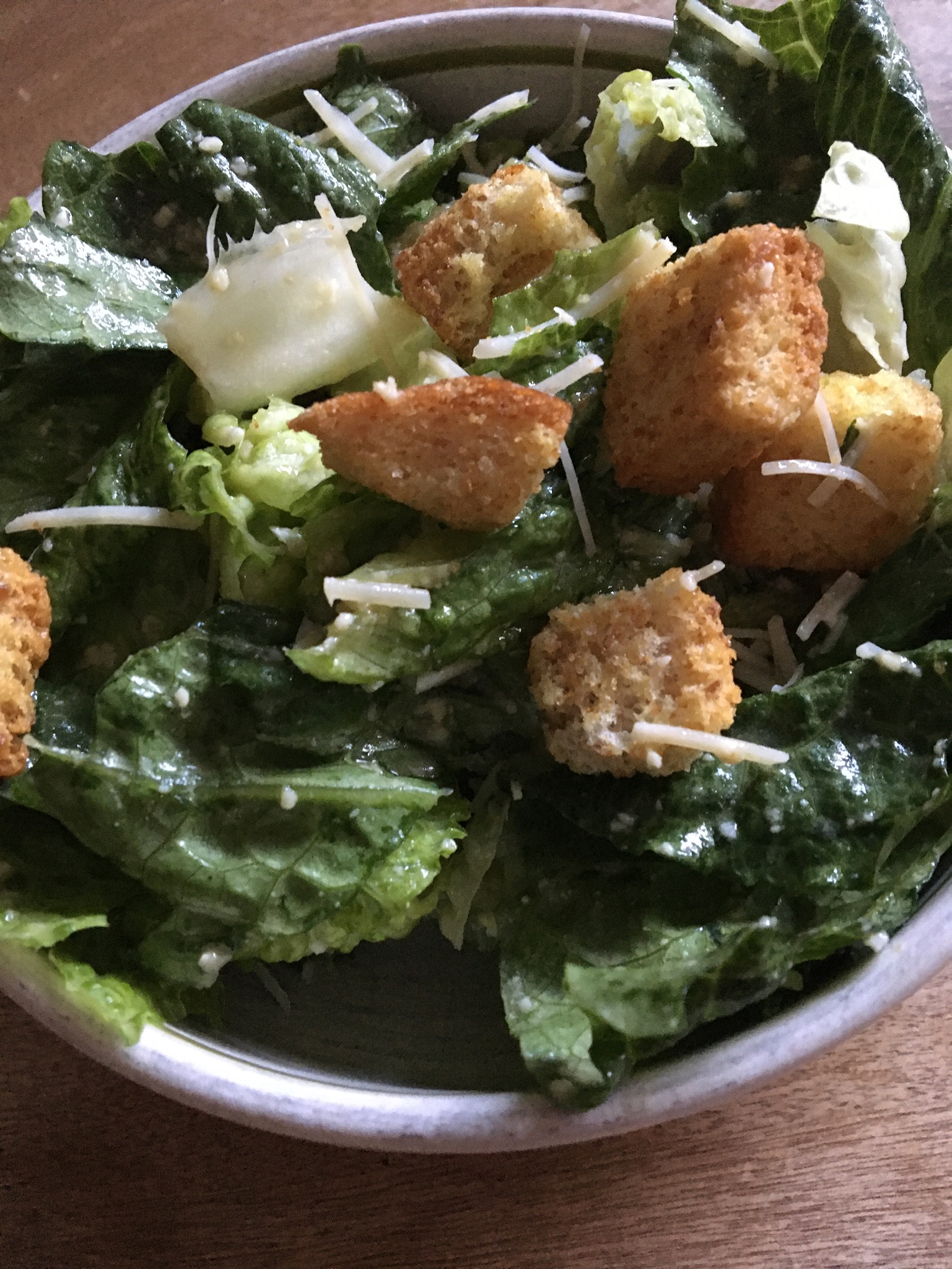Another recipe from my brother. I like how he just whips things up because he knows the basic idea of what should happen. He and I and my daughter and a friend were at our cabin in Delta Junction when he decided to make chocolate souffle. Please understand that at the cabin, the water comes off the roof into a cistern and is then piped into the house . . . when it works. Sometimes we just bring water from home in jugs because it’s easier. Electricity at the cabin (to run the water pump and a kitchen light) is provided by a couple small solar panels hooked to a couple car batteries. Other lighting is from kerosene lamps. The gas range is fueled by propane, a small tank like for a barbecue. The bathroom is a walk to the outhouse. Grey water for washing is thrown over the side of the deck. And he’s going to make a chocolate souffle. First, there wasn’t any chocolate powder or chocolate chips to be found among all the food left behind through several years. He handed a Ziploc of old M&Ms to the girls and told them to start pounding them with a hammer. He whipped up eggs and whatever else goes into a chocolate souffle, mixed it with the crushed M&Ms and we had the most delicious chocolate souffle I’ve ever eaten. That’s how my brother rolls. Anyway, this is his very tasty recipe for Caesar Salad.