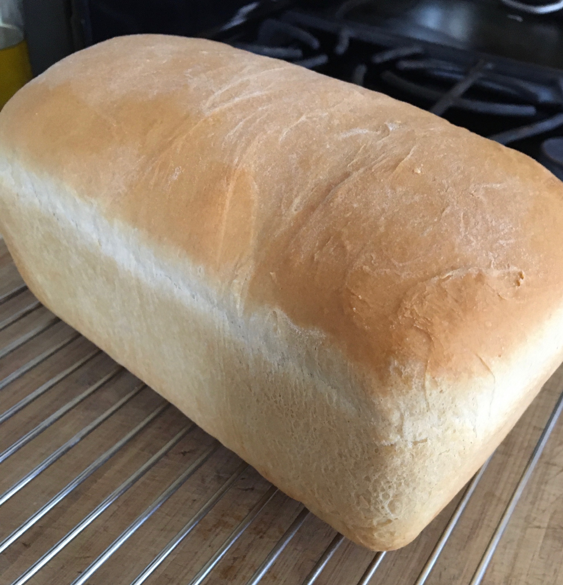 In the bowl of a stand mixer fitted with a dough hook, stir together the yeast, sourdough starter, and sugar. Once the yeast has started to dissolve, stir in the powdered milk, salt, butter, and 1-1/2 cups flour. Turn the machine on low and let it mix for 5-8 minutes to build the gluten. Start adding flour a little at a time until the dough comes away from the sides of the bowl and clings to the hook. The dough should feel smooth and elastic. Remove the dough hook and cover the bowl. Let sit in a warm place for a couple hours or so, until the dough has doubled in size. Punch it down and form into one loaf. Spray or grease a 9×5″ loaf pan and set the dough into the pan. Let rise in a warm spot until it rises level with the top of the loaf pan. Preheat the oven to 350 degrees. Bake at 350 degrees for 40-50 minutes. Bread should sound hollow when tapped and it should be a golden color all over.