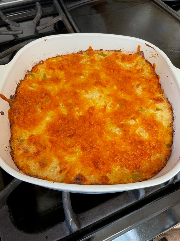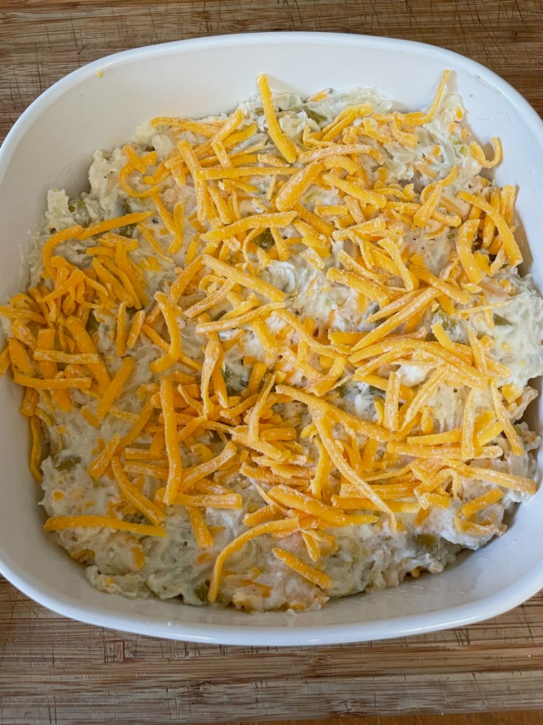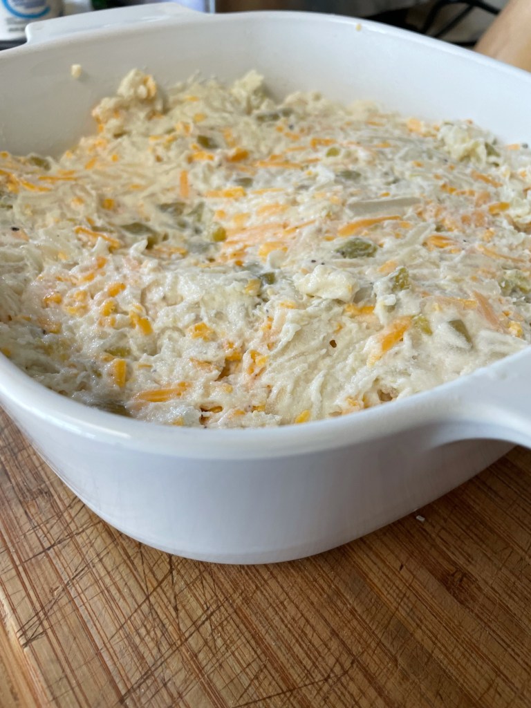 I’ve been trying to tweak this dish since I first had it at a family gathering. It was so, so good that I wanted to add it to my arsenal of gluten-free foods. You could go a lot of different ways with this to punch up the flavor. I’ve used canned diced green chiles here, but consider how bacon bits would be amazing.