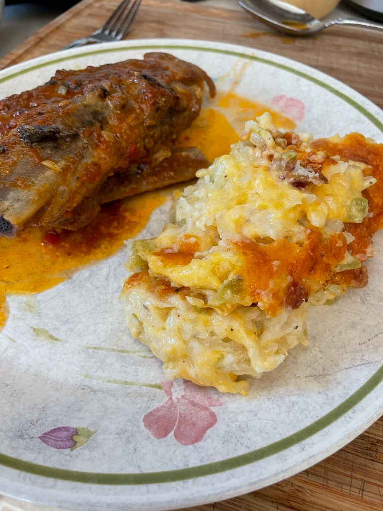 NOTE: Parboiling was an interesting challenge as I had never done that before. It means to boil the potatoes whole, or in large pieces, until the outsides are tender, but the insides are still hard. Kinda tricky. They shred rather nicely, though. I used a hand shredder one time and then another time I used my Cuisinart shredder attachment. Either way is fine. The dish requires a generous amount of salt. The first time I tried this I didn’t use enough and the whole thing was rather, muh blah. The last time I made it using garlic sea salt. REALLY good! When I ate this at Easter dinner for the first time, Andrew and Sharon had added just a teensy bit of diced (I assume pickled) jalapeno. My husband thinks I’m killing him with spicy food, so I didn’t put any jalapenos in the potatoes. The baking time will depend upon how big and how parboiled the potatoes were to begin with. You want to make sure they’re very soft before removing the finished product from the oven. I served these with stove-top pork spare ribs in a type of barbecue sauce. The potato dish’s green chile component complimented the ribs nicely.