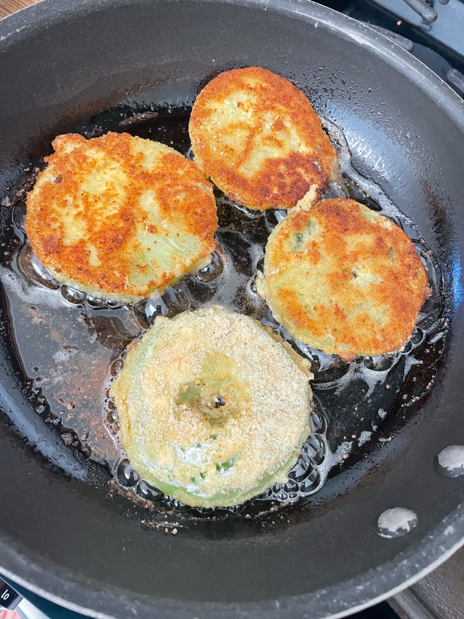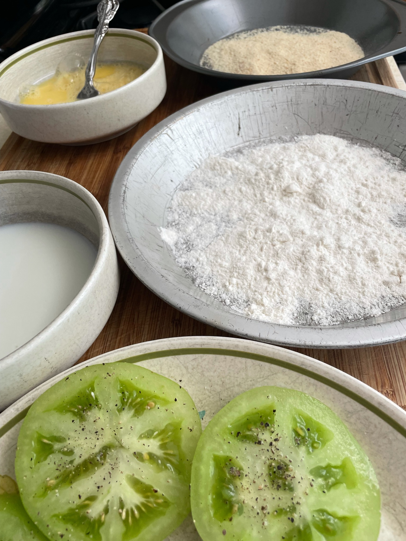 Slice the green tomatoes about a half inch thick. Salt and pepper the slices and let them stand for fifteen minutes or so. Heat about 1/2″ oil over medium heat in a skillet. Dip each slice into the milk, then dredge through the flour, dip into the beaten egg, and finally dredge through the bread crumbs. Gently lay slices in the skillet. Do not crowd them, keep good separation. Fry over medium heat until the bottom is browned, then flip over. It can be tricky to get a good sear on the outside, yet an edible center. Don’t undercook or overcook. Sorry, you just have to watch. I turn mine over frequently until I see bubbles from the center.
