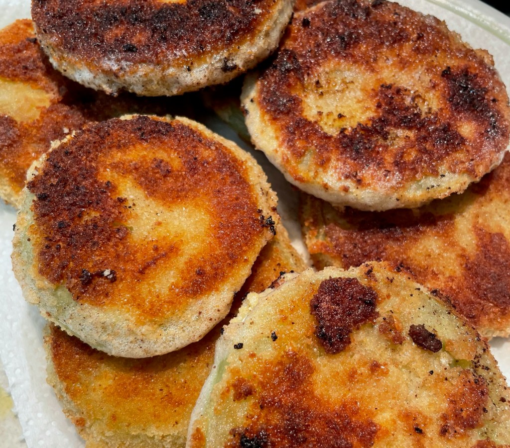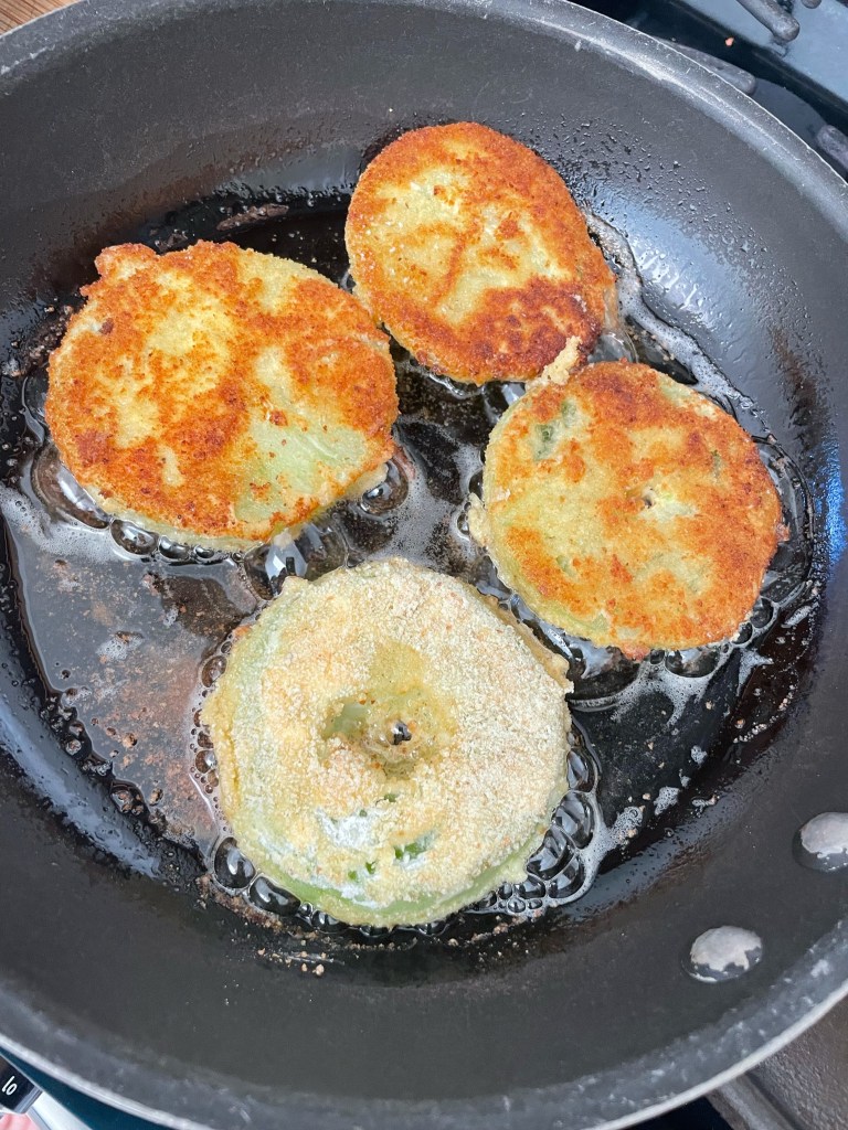 I really like these. We have access to very large green tomatoes locally from Bell’s Nursery during the summer months. In the fall, sometimes we harvest our own green tomatoes, but they’re usually too small for frying. The reason I like this method of preparation is that the slices hold up well, so you can easily eat them by hand.