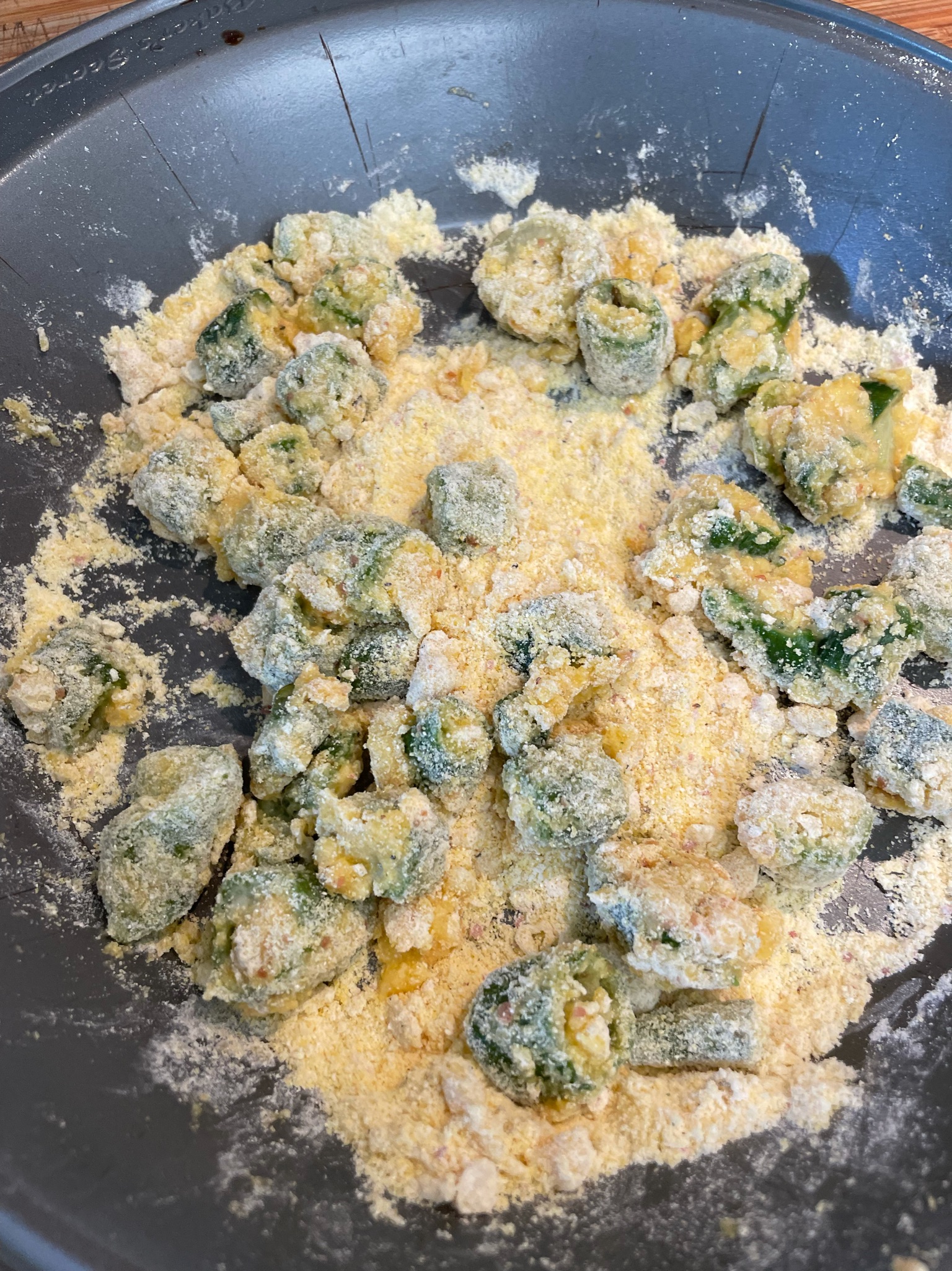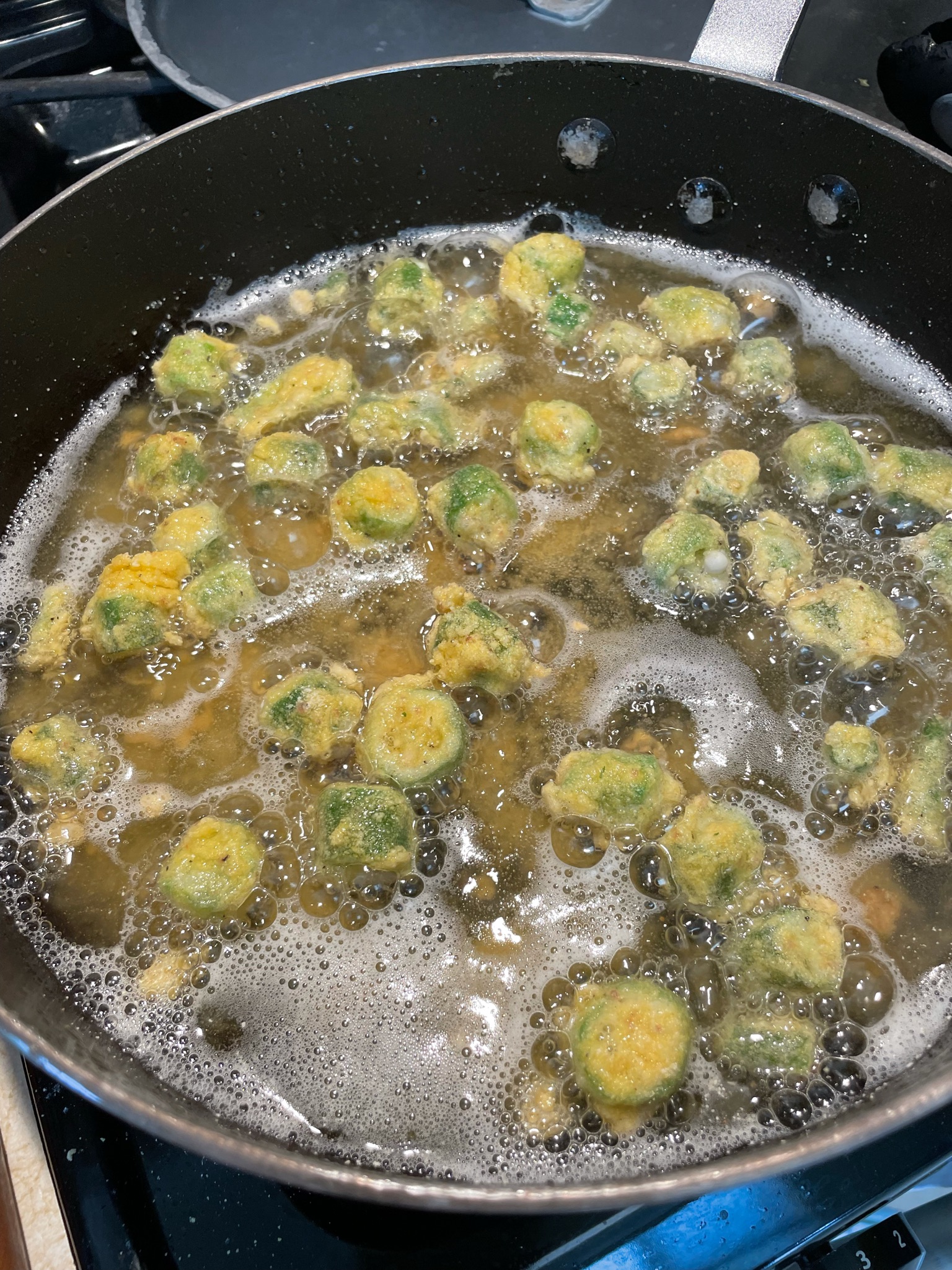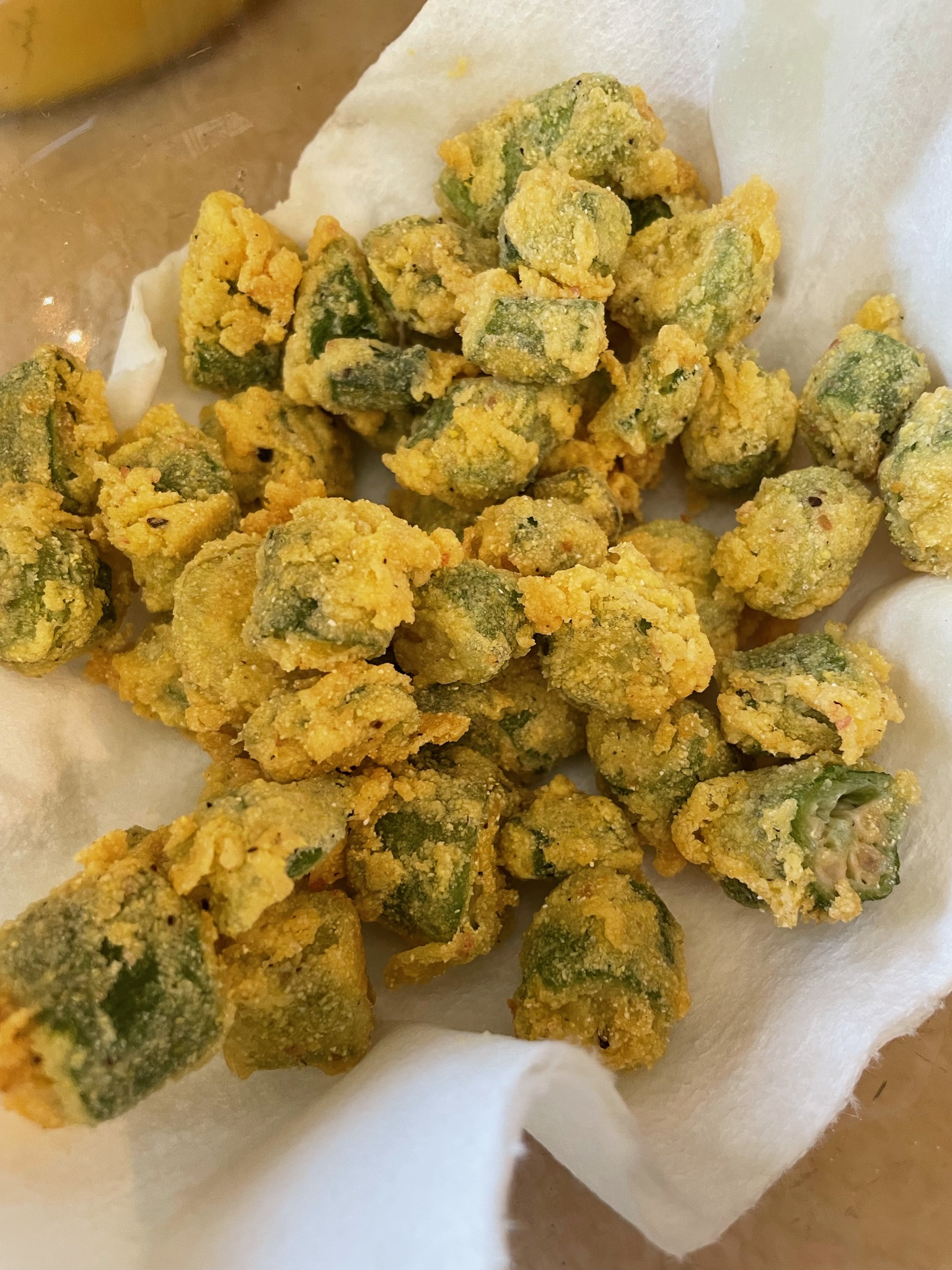 This may be an acquired taste, I couldn’t say. My dad grew up in Texas and eating okra is not strange to me. I’ve only been to Texas two or three times in my life and we did not have fried okra a lot while I was growing up. On one of the occasions we did visit Texas I remember being with Grandma and stopping by to visit my father’s cousin, Doris Marie. She was in the kitchen frying okra. I will never forget the smell, the look, the taste. Oh, my, it was mouth-watering. But I like mine better! Ha!