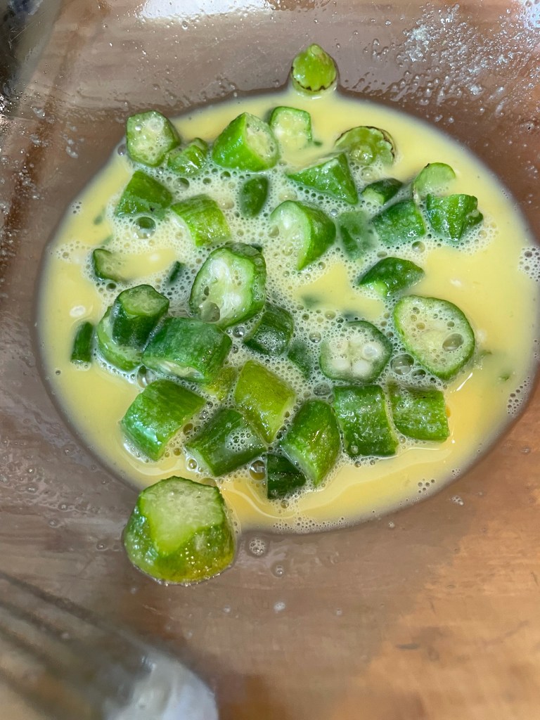 In a medium bowl, beat the eggs. Stir in the mostly-thawed okra.