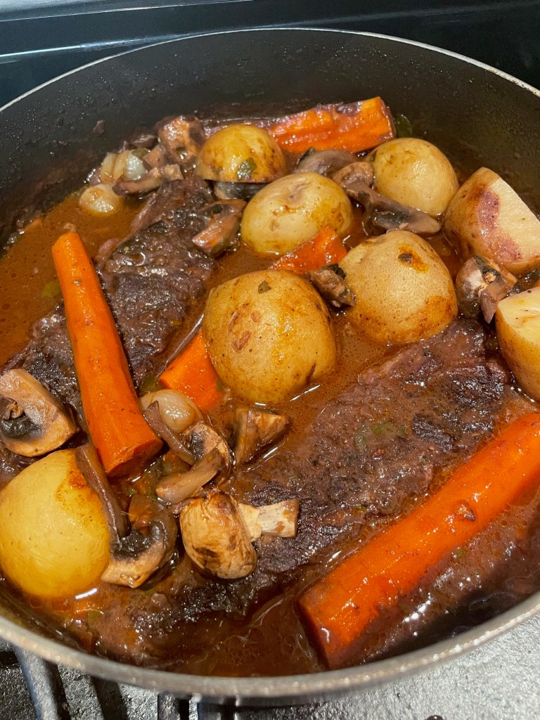 Add onion and carrot to the skillet and saute until the onion is translucent. Stir in the flour and tomato paste*. Let that heat for about a minute. Stir in the red wine and let it simmer, stirring frequently, until it’s reduced by half. Don’t rush this. Just let it do its thing. Stir in the herbs and the beef broth. If you are using an oven proof skillet, lay the beef on top of the sauce. If not, then pour the sauce into a small baking dish and lay the beef on top of the sauce. Cover the skillet or dish and bake at 325 degrees F for one hour fifteen minutes.