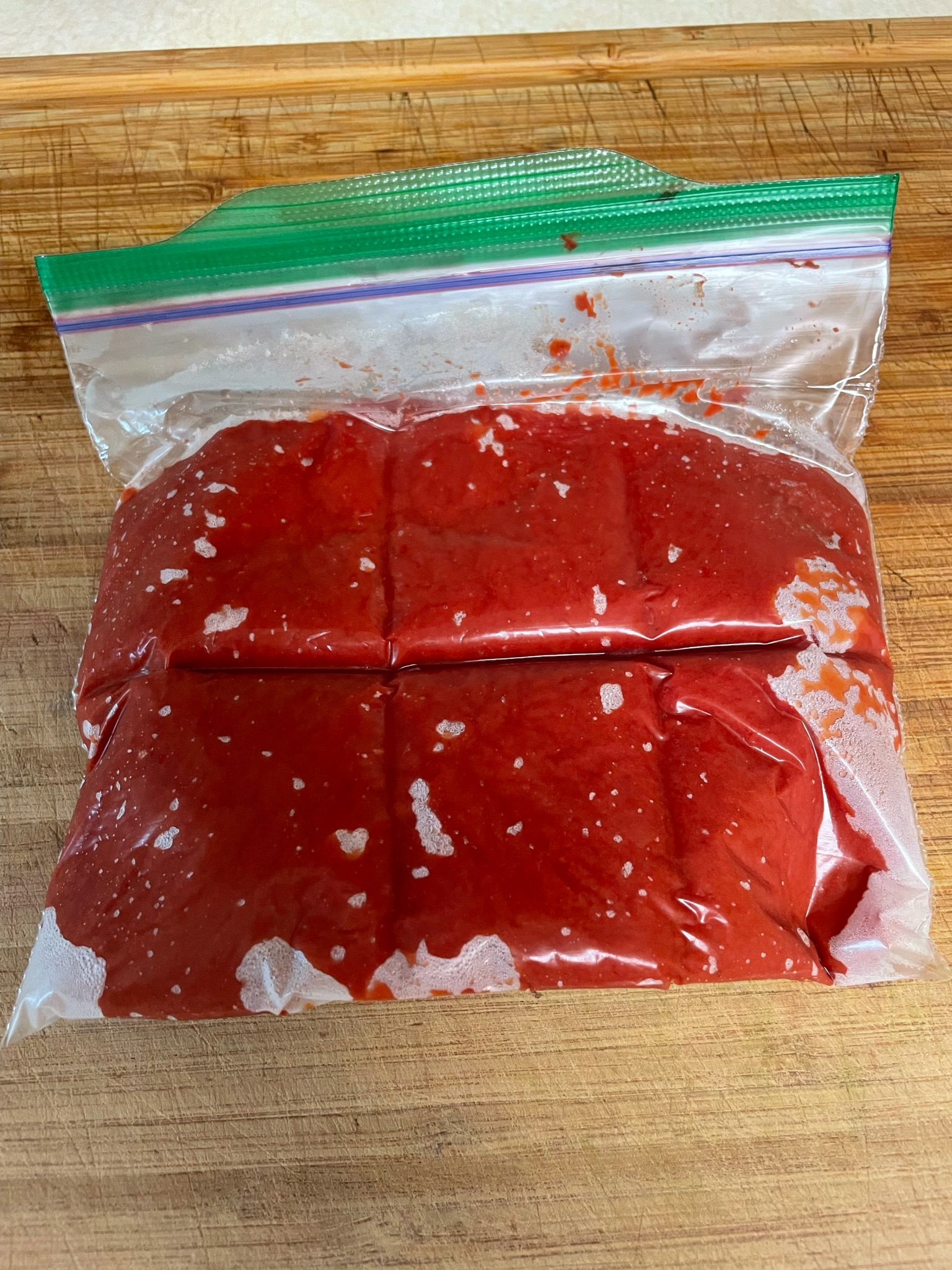 *Here’s a trick I learned awhile back to save tomato paste. When a recipe calls for just a dab, but you have to open a whole can, take out what you need and then empty the can into a plastic Ziploc sandwich bag. Smooth out the bag to make it flat. Using the dull edge of a knife, gently score the bag into six sections. Each section should be roughly a tablespoon. Gently place the bag flat into the freezer. Next time you’re ready to use a little bit of tomato paste, pull out the bag, break off a section, and put the bag back in the freezer. Now you have a tablespoon of frozen tomato paste, ready to thaw, and use. I usually add my square of frozen tomato paste into the liquid, if using. I don’t spend any time thawing the little square.