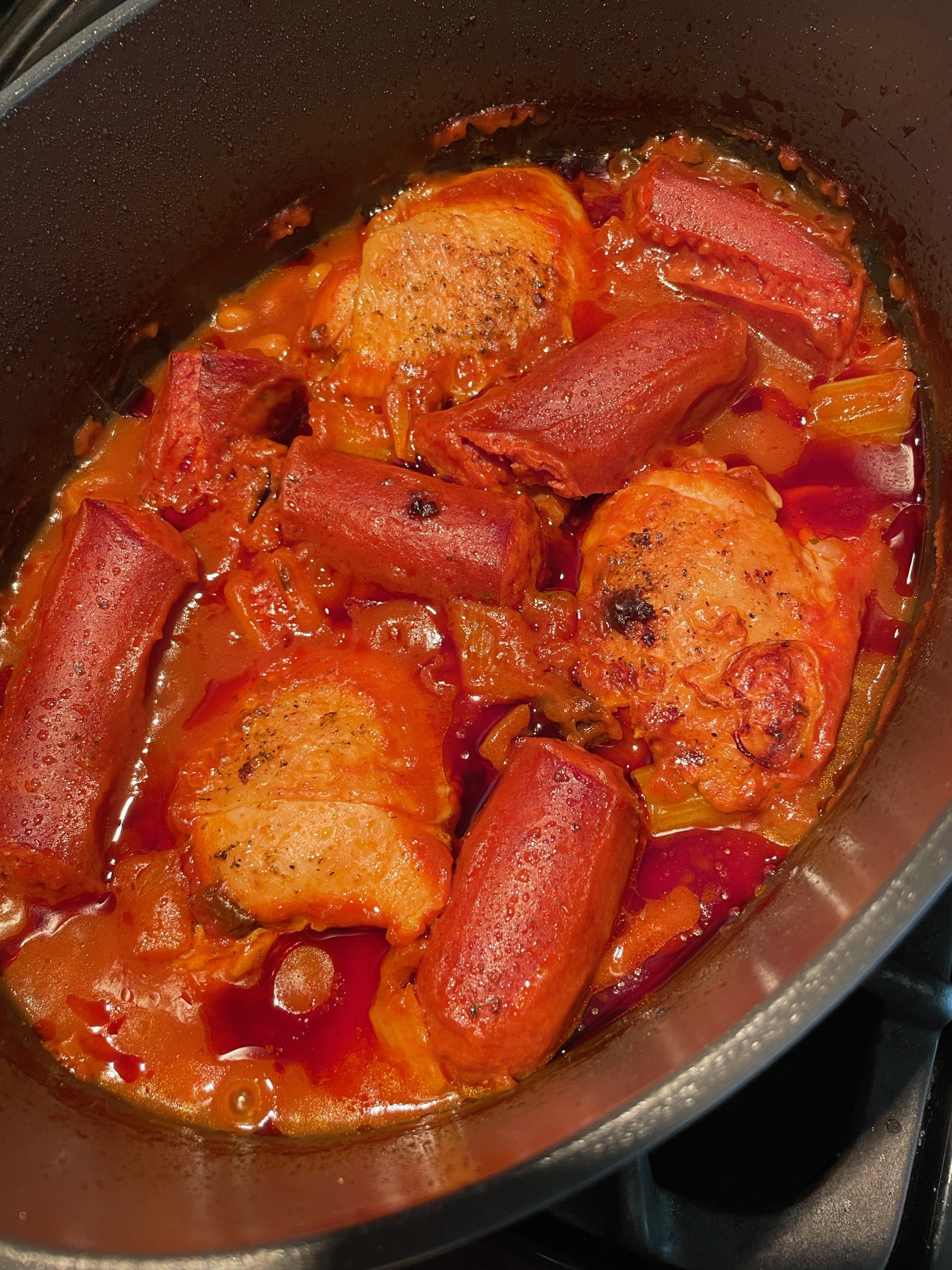 NOTES: Finding unsmoked kielbasa is a challenge. I think the dish will be great if you use a smoked sausage. I’m still using up a case of tomato puree that I bought awhile back. This is one of my favorite recipes for it. I made my own puree once by draining a 14 oz. can of tomatoes and pureeing the remaining tomatoes in a blender. Alternatively, you could try using about 4 Tbsp. tomato paste and a cup of chicken broth. I did not drain the fat from the pan before I added the vegetables, but you could do that if you had rendered what you considered too much fat from the chicken. I have used the automatic setting on my oven, so the dish was finished and sat with the heat turned off for 30-45 minutes. No problem. I was hoping it would be one of those leave-and-come-back-when-it’s-finished dishes and it was! The chicken just fell apart and was fork tender. No knives needed at the table. I suppose if you don’t have a Dutch oven you could use any type of appropriately sized baking dish, then just do everything in a skillet until you get to the baking part. I think 9 x 13″ might make too thin of a bean layer, so a dish with less square inches, but taller sides would be best. You never know until you try, though! Go forth and cook!