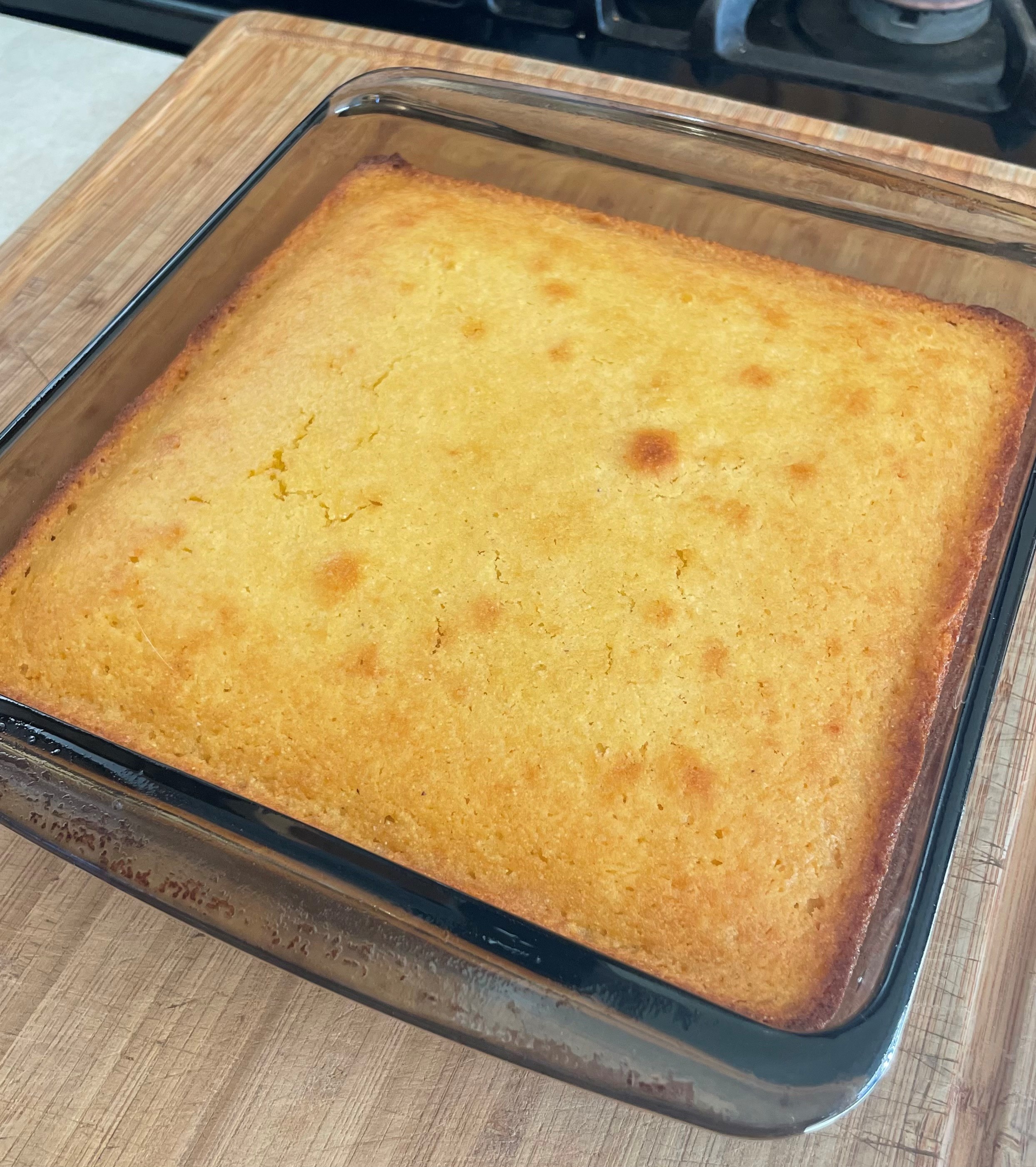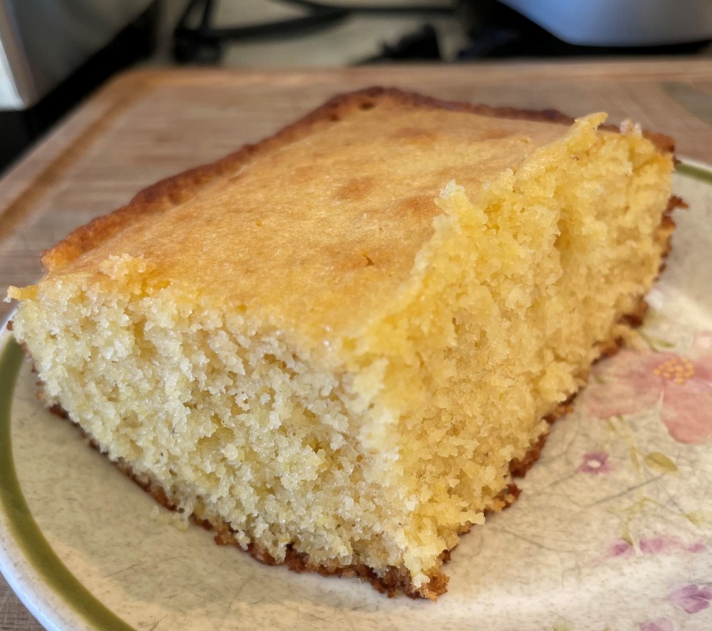 In a separate bowl, stir together dry ingredients. Gently stir the dry ingredients into the butter mixture and stir until most of the lumps are gone. Pour into the prepared baking dish and smooth the top. Let it stand for three minutes. Bake at 375 degrees for 25-35 minutes. It’s done when a cake-tester comes out clean. It will be golden brown across the top. You may brush the optional 1/2 Tbsp. butter across the top of the hot bread. Let stand 5-10 minutes, slice, and serve.