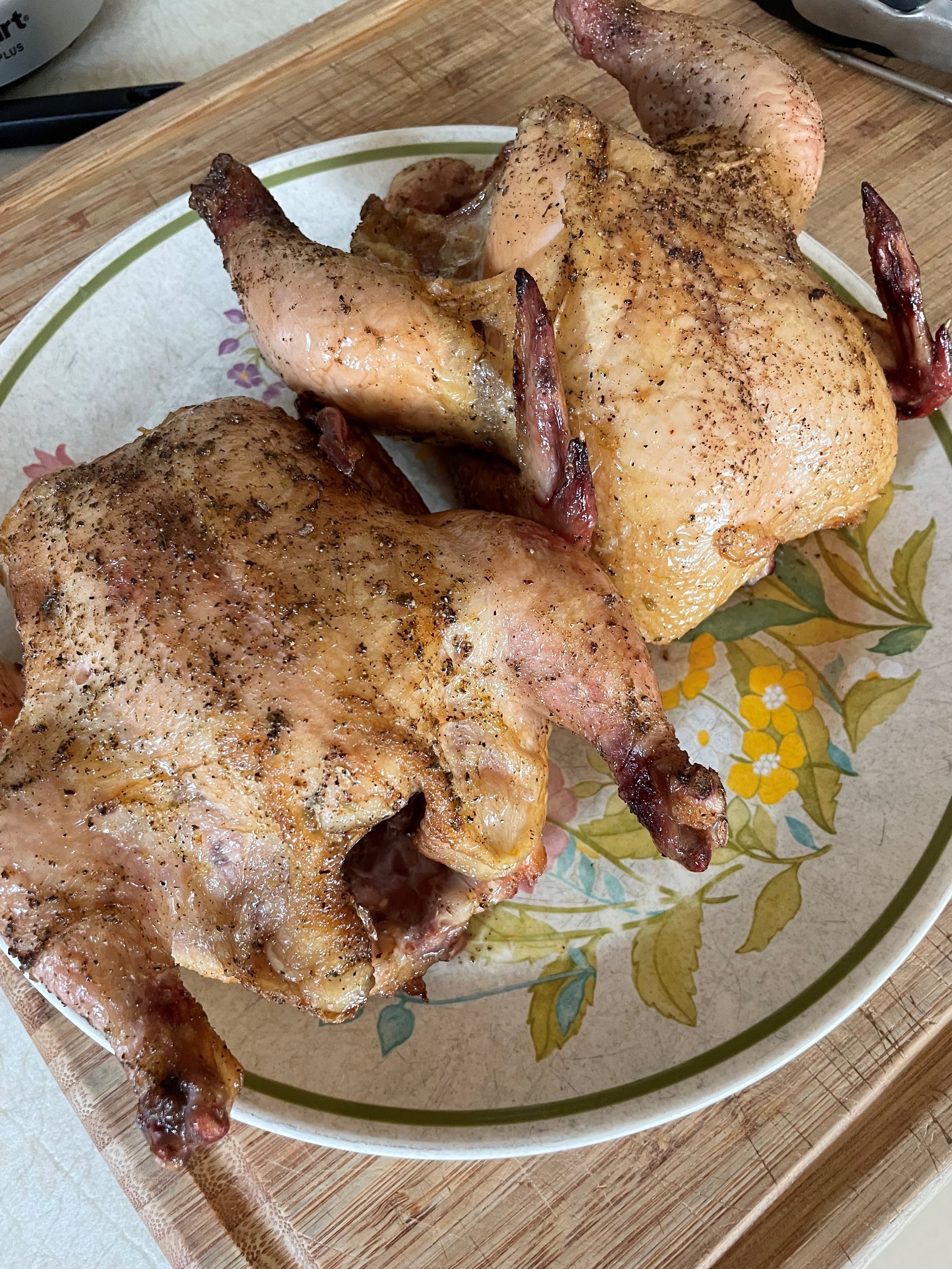 Notes: I’m using a pellet smoker (Traeger). This is so simple to do. If the hens are chilled when you place into the smoker, it’s going to take longer. I did this with two hens. If there are more in the smoker, it’s going to take longer.