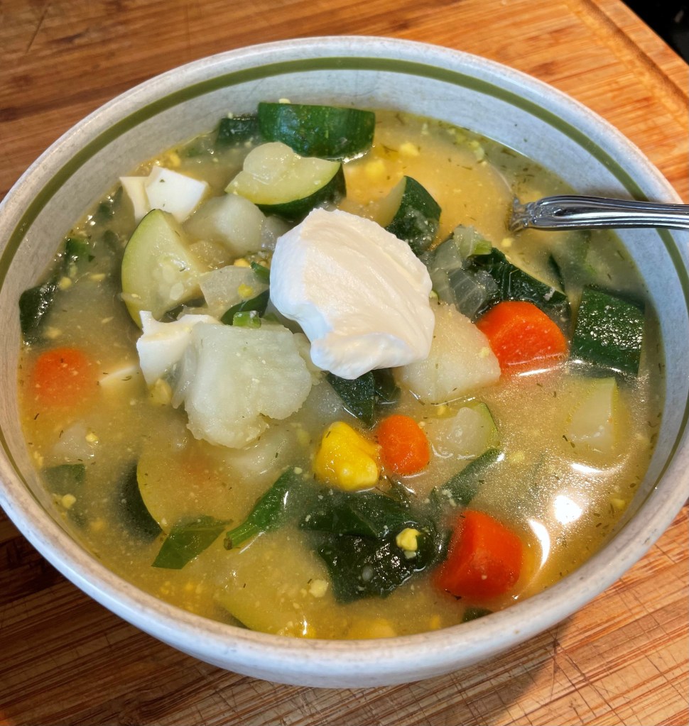In a large cooking pan, stir fry onion and carrot in a bit of olive oil until the onion is translucent. Stir in chicken broth, dill weed, salt and pepper. Bring to a boil and then reduce heat. Let it simmer until the carrot is nearly cooked through. Stir in the potatoes and simmer until nearly cooked through. Stir in the zucchini and simmer a couple minutes. Add more broth now if you think it needs more. Stir in the spinach. Simmer for a couple minutes longer. Stir in lemon juice and eggs. Serve with a dollop of sour cream on top. The yield is about 4 servings.
