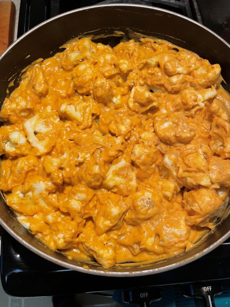 Melt butter in oven-safe skillet over medium heat. Add onion and sauté until soft. Stir in olive oil and flour. Continue heating and stirring until the onion and flour mixture has formed a paste. Stir in the milk. Continue stirring until the mixture is bubbling. Stir in pumpkin and spices until evenly mixed. Stir in the cheese a handful at a time until it is melted and you have a smooth sauce. Remove from heat and stir in the cauliflower florets until all are well coated with sauce. Bake at 425 degrees for 25-30 minutes. If you would like the top to brown more, pop the dish under a broiler for a few minutes. Serve!