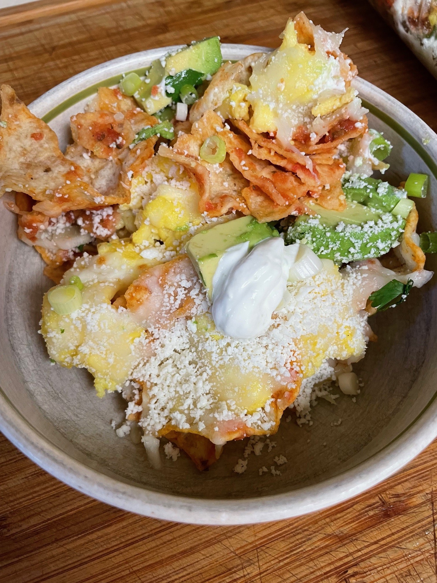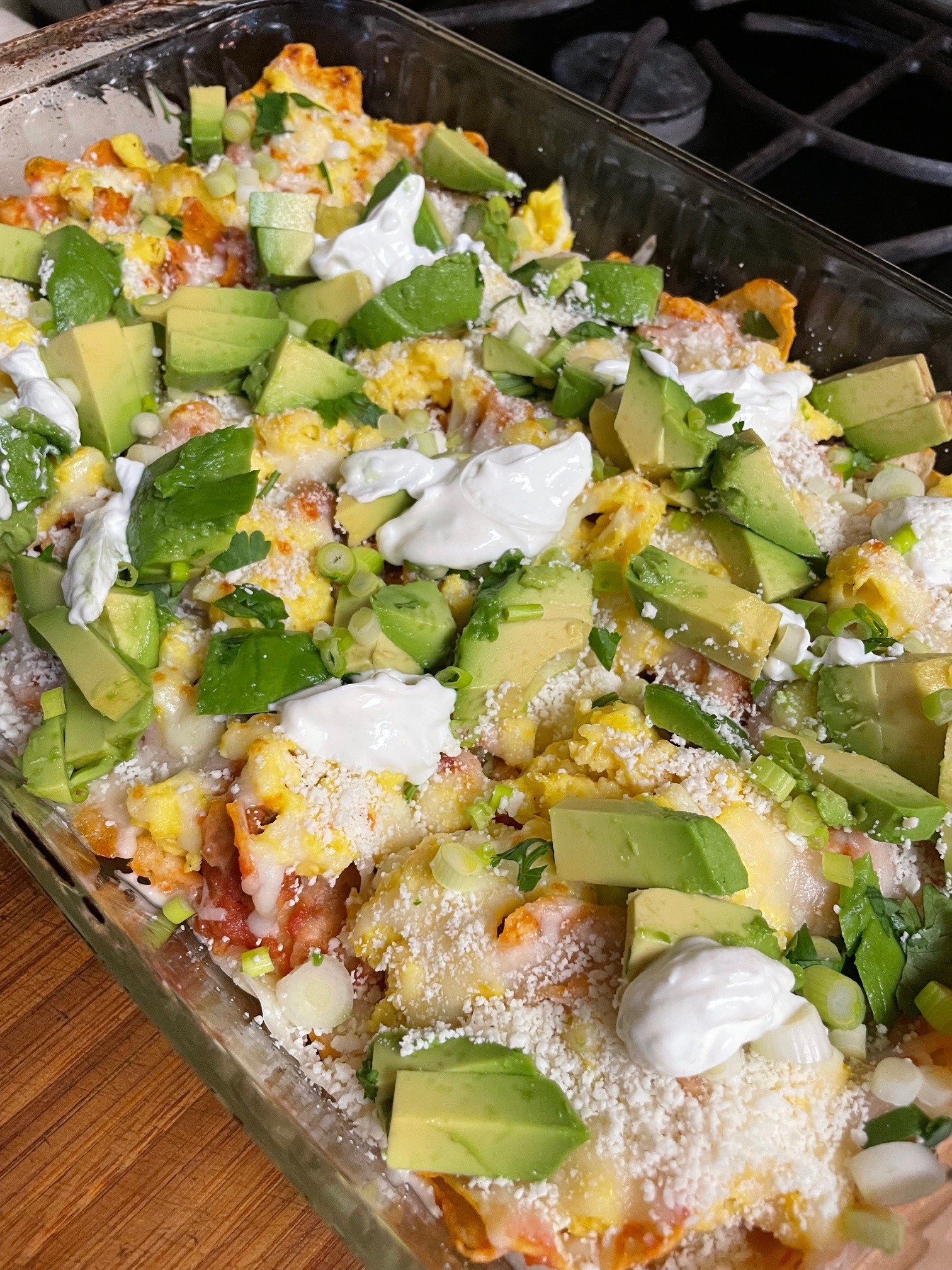 Pour warm tortilla chips into warm salsa and stir until well coated. Spray the 9×13″ baking dish with non-stick spray. Pour the tortilla-salsa mix into prepared baking dish. Distribute the scrambled eggs across the top of the tortilla mix. Sprinkle with Queso Quesadilla cheese. Place under broiler flame until cheese melts. Remove from heat. Sprinkle with cilantro, Cotija, avocado, and green onions. Dollop sour cream across top, as desired. Serve warm. Serves 4.