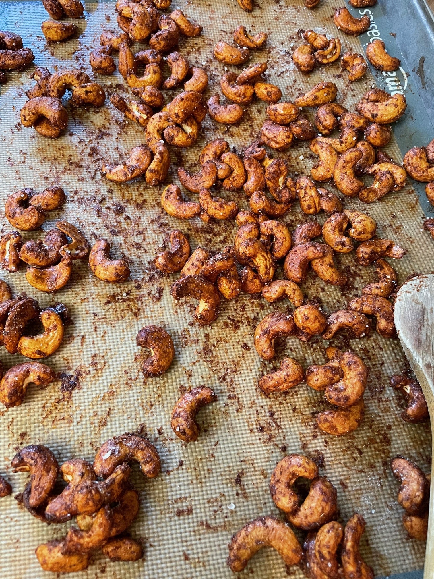 Preheat oven to 350 degrees F. Prepare a baking sheet with a silpat or parchment paper. Spread the cashews across the prepared baking sheet and roast for 5 minutes. Remove from heat and let cool a little bit.