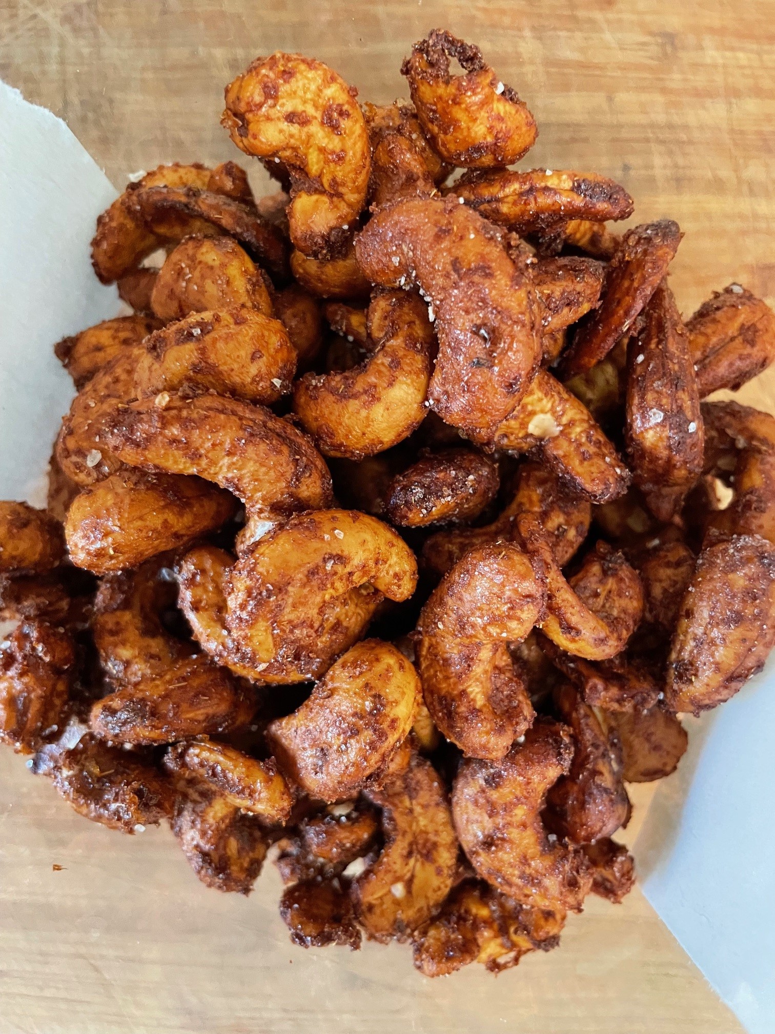 In a medium bowl mix together spices, honey, and sriracha. Stir in the warm cashews and stir until nuts are well coated with the honey mixture. Spread over the baking sheet and roast in 5-minute intervals for 15-20 minutes, stirring every 5 minutes. Remove from heat once they are mostly dry and darkened in color. Sprinkle with salt. Let cool. Serve.