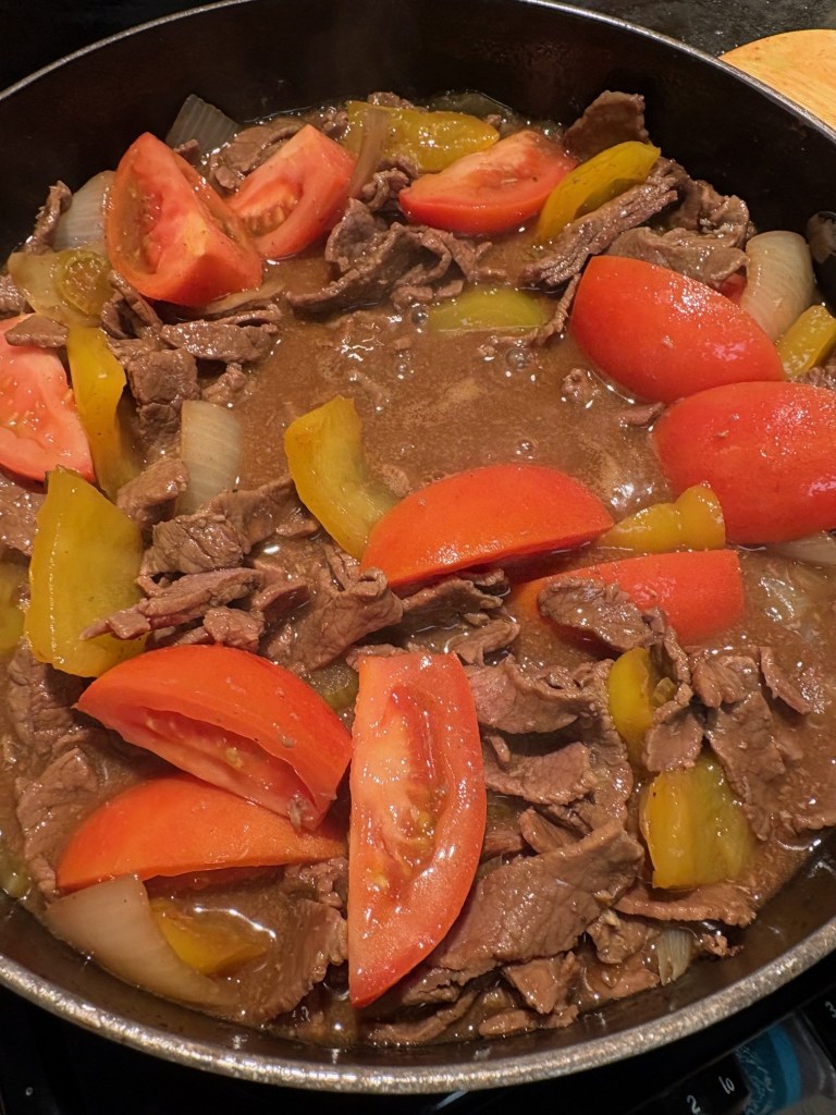 NOTES: In the photos I’m using a beef cut called Beef Milanesa. It’s a round steak sliced very, very thin. Usually I use Beef Milanesa cut to make Rouladen. But this time I sliced it short-wise and threw it into the skillet. Under normal circumstances, I wouldn’t slice the meat this thin. This was my mother’s recipe and I grew up eating this dish. I wrote the recipe down when I was a teenager. Since then I’ve mostly done this from memory and I’ve made a couple little tweaks to the way I like it. For one thing, I like my vegetables soft so most people will think this is overcooked. Just do it the way you like it. I really dislike chewy meat, so I err on the side of really cooking it until falling apart. Again, you do you. This is a very saucy dish. Ha. If you would like more sauce, or less, keep in mind the ratio for a medium sauce is 1 Tbsp. cornstarch to 1 cup liquid. FYI, the cornstarch will only dissolve in cold liquid, so you must dissolve it before adding to your dish. Voila!