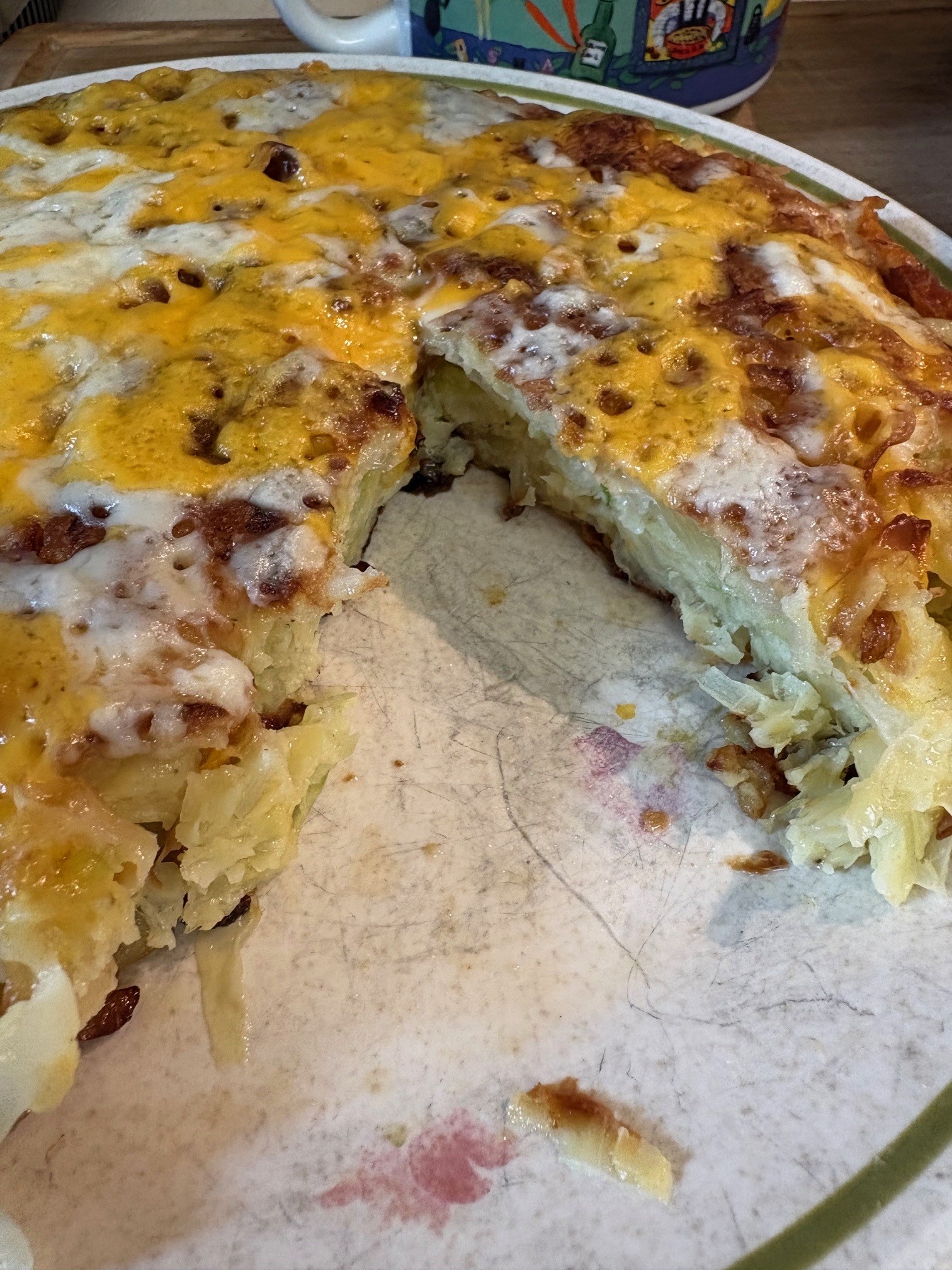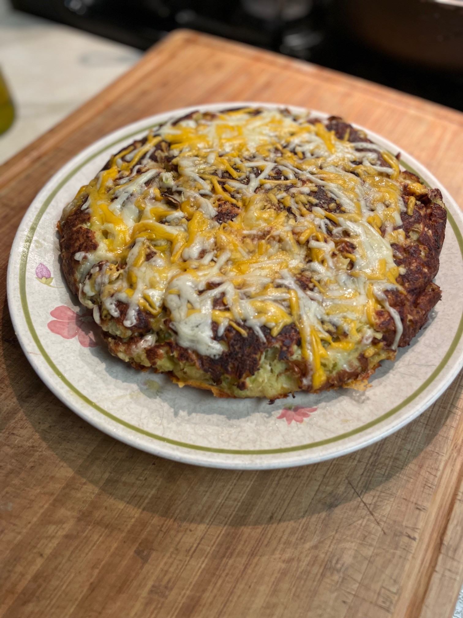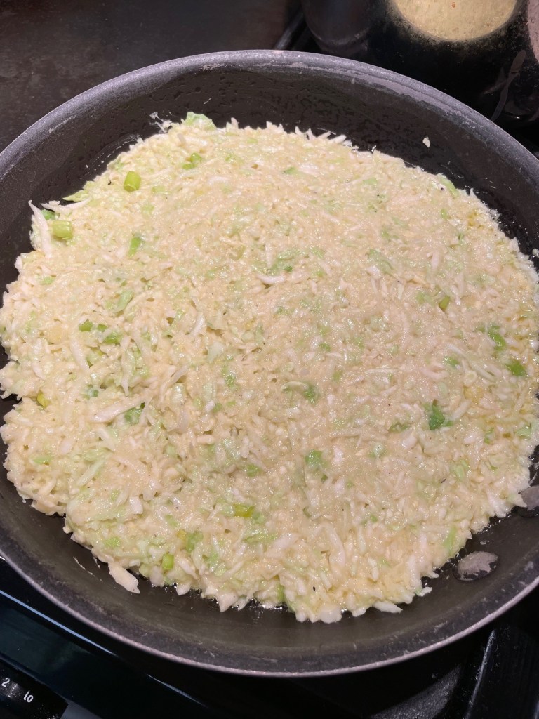 Heat a skillet (12″ with a sloped edge is best) over medium heat and pour a couple tablespoons of olive oil into it. Swirl the oil so it coats the sides as much as possible. Place the cabbage mixture into the skillet and press it down. Reduce heat to low and cover skillet. Let it cook for 15 minutes. Lift cover and see if the bottom is brown and comes away from the skillet easily. If yes, flip the skillet upside down so that the cabbage slides onto a plate. If it’s not ready, then cover it back up and wait for it to brown and come away from the pan. Swazz a bit more olive oil into the skillet. Heat it and then slide the cabbage into the skillet, uncooked side down. If you’re using cheese, sprinkle it over the cooked top. Cover. Let it cook another 15 minutes. Check that the cabbage is cooked through. Remove from skillet and serve.