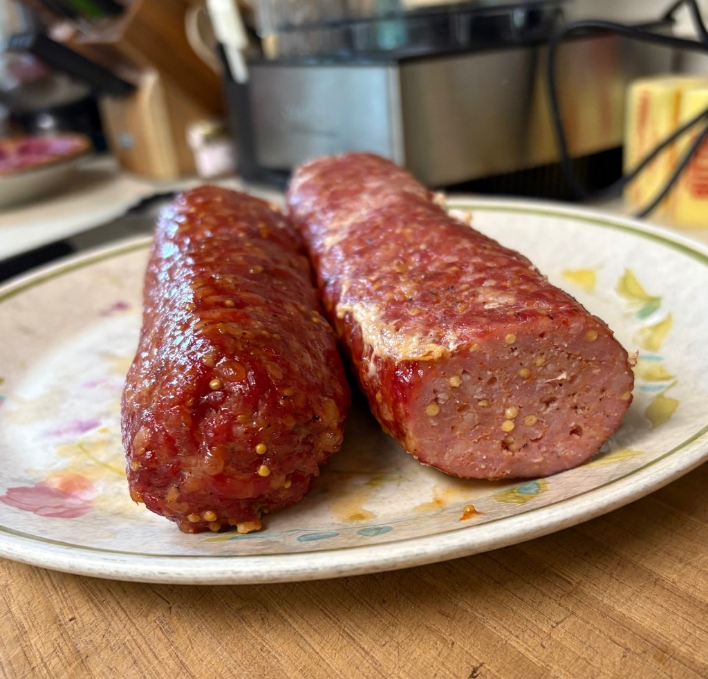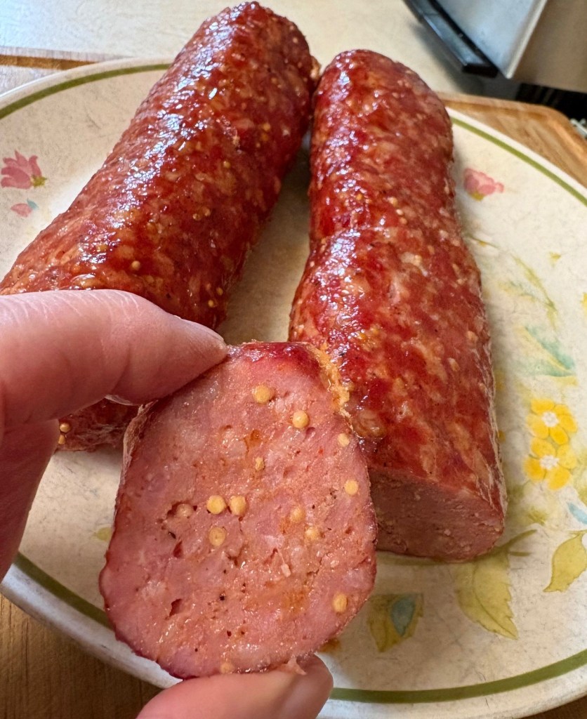 NOTES: I smoke quite a number of things in disposable aluminum baking dishes and/or parchment paper. I did not try this on the racks, only in the pan for easy clean-up. I used to make summer sausage many, MANY years ago in my oven before I had a smoker. Back in the day, I used game meat, like moose or caribou. Now I have a lot of ground pork, so pork it is. This turned out quite beautiful and really tasty. I made up my own recipe, but many thanks to Rosemarie’s Kitchen for reminding me that summer sausage can be easily made at home. I do not think that the curing salt is absolutely necessary. Please, please do not confuse it with Himalayan Pink Salt. It is not the same. If you do use curing salt, remember to err with less, rather than more.