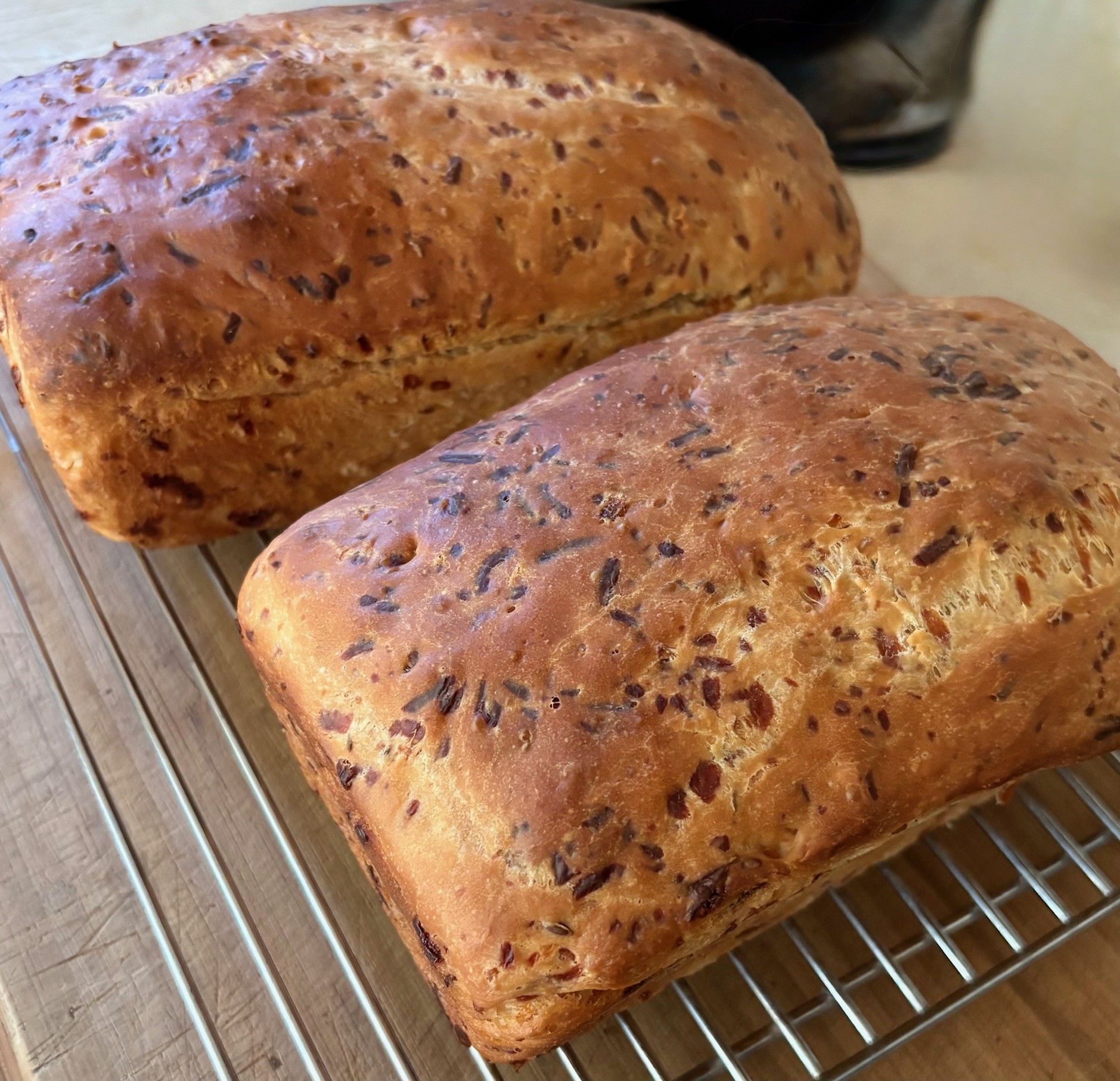 Stir the batter down and spoon into 2 generously greased or sprayed 4-1/2 x 8-1/2″ loaf pans. Cover and let rise in a warm place until almost doubled (about 45 minutes).