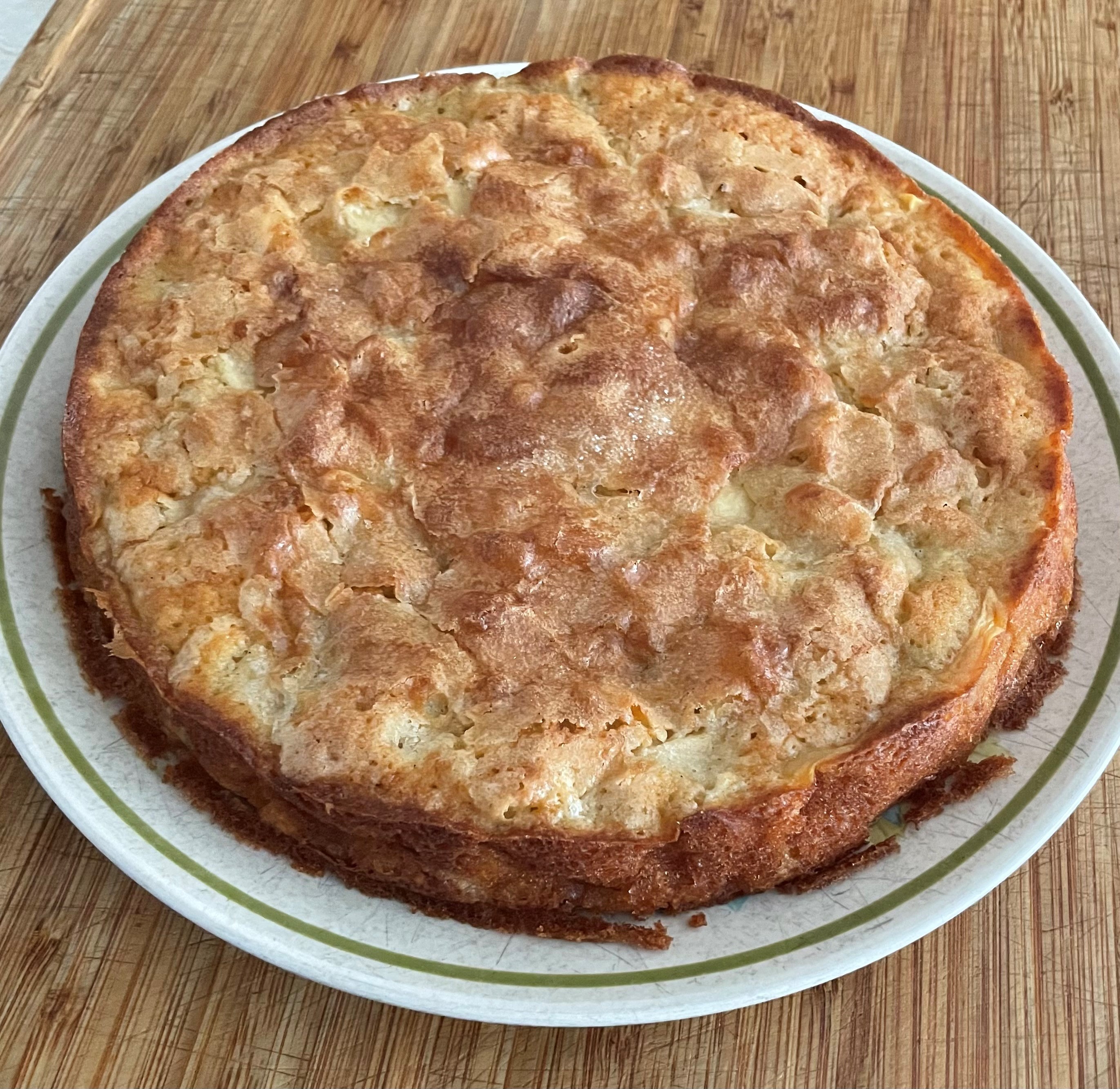 In a small bowl, stir together the flour, baking powder, and salt. Beat this mixture into the butter mixture under slow speed until just mixed. By hand, fold in the chopped apples. Dollop into the prepared cake pan and smooth out the top. Sprinkle the top with sugar, about a tablespoon.