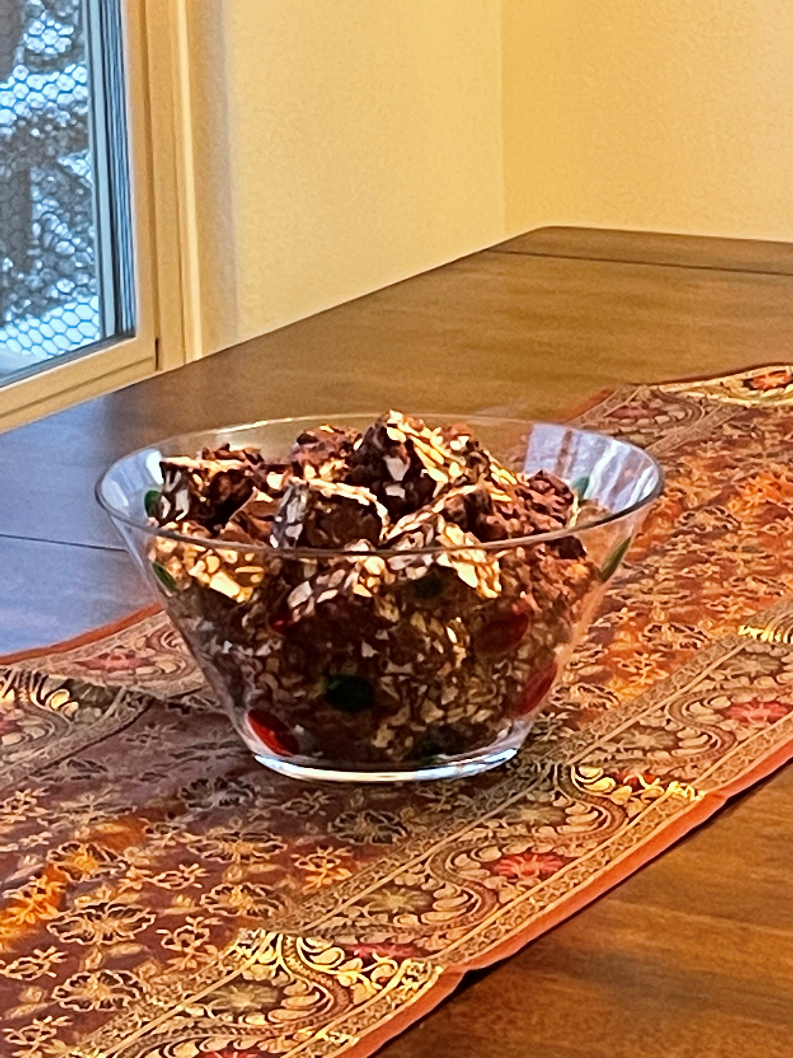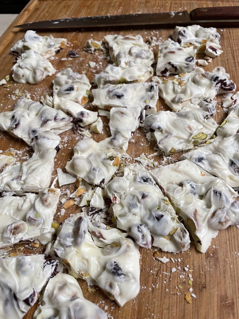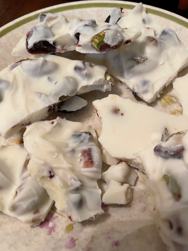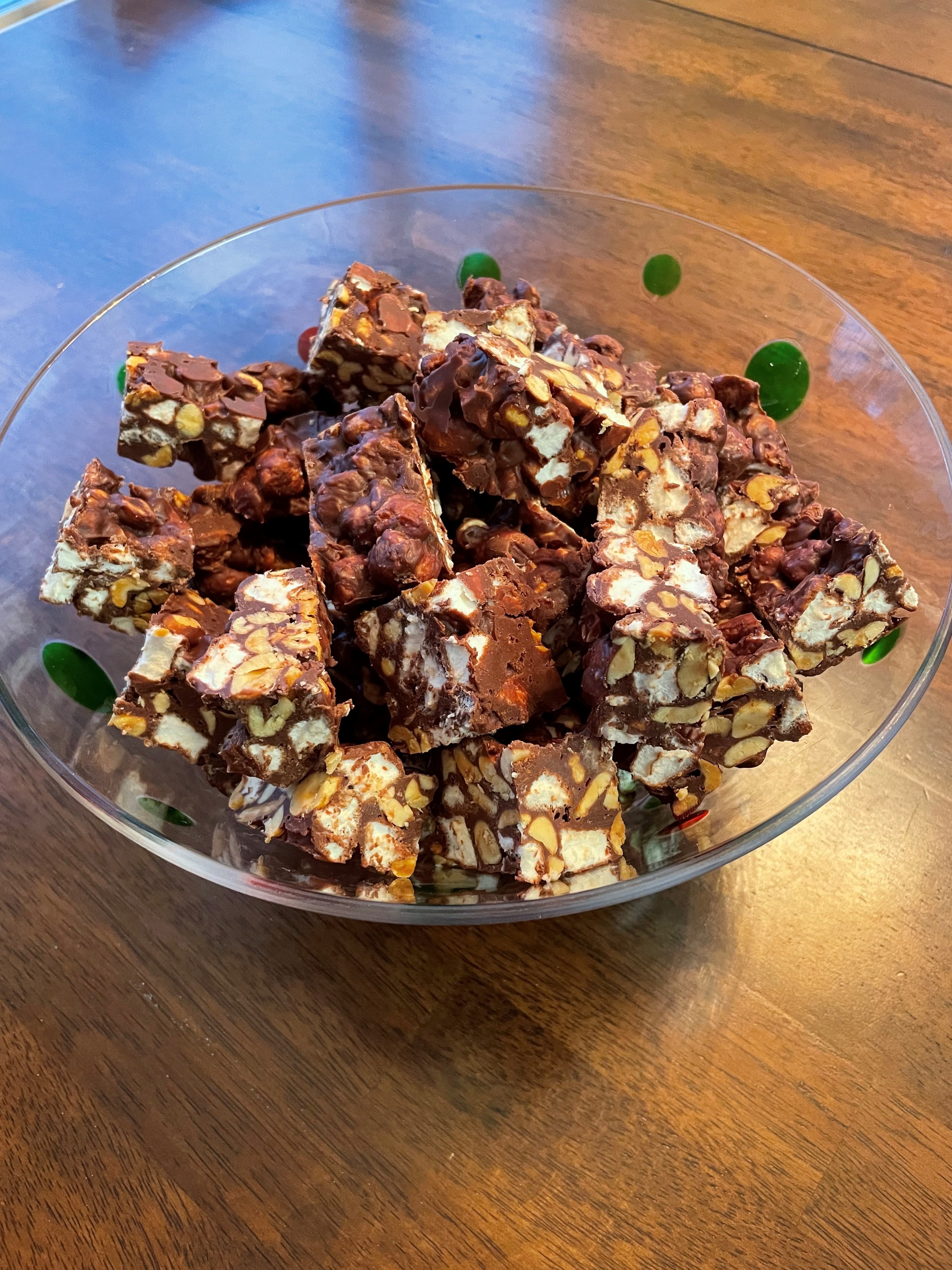 Here are photos of before refrigeration and another to show you how much it makes — huge amount! This is an expensive recipe, but it’s super easy and takes just a few minutes to throw together. Make sure you use a really large pan to melt and stir everything together in. Those marshmallows take up a lot of space. It’s very pretty when sliced and served. Tastes REALLY yummy, too.
