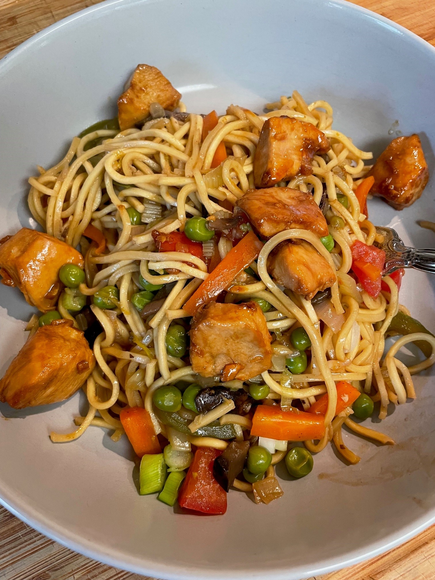 NOTES: If you’d like a more saucy Chicken Adobo, remove from heat after the chicken has cooked through (it won’t take long), but before all the sauce evaporates. I started with the Chicken Adobo recipe from lowcarbyum.com and the Pancit Canton recipe at manilaspoon.com.