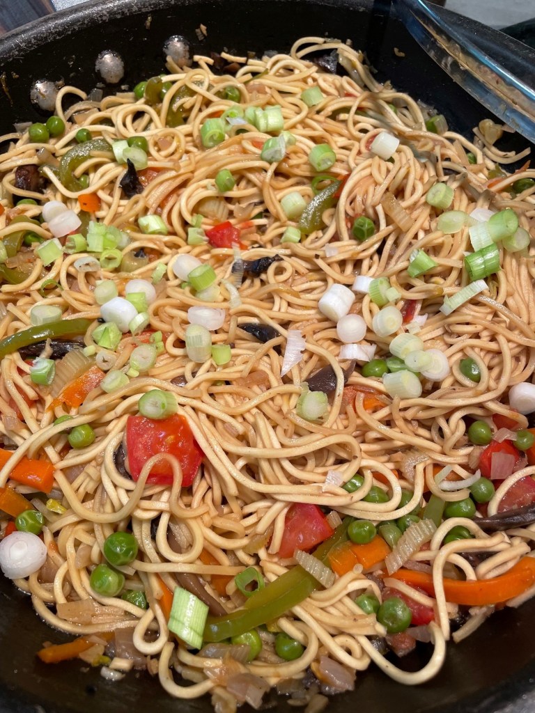 In a VERY large skillet, heat oil and stir fry the 1/2 cup scallion and the garlic until soft, just a minute or so. Stir in the 2 cups of vegetables that you’ve selected. Let that cook a few minutes, or more, to soften. [I like my vegetables really soft. I cover the skillet for awhile so the vegetables steam.] Stir in the sauce that was set aside. Bring to a boil. Place the noodles into the skillet. Press and fold them, turning over and over, until they have mostly absorbed the liquid. It may be easiest to cover for a minute or so. Once the liquid has been fully absorbed, it’s finished! Sprinkle the top with the two sliced scallions and serve warm.