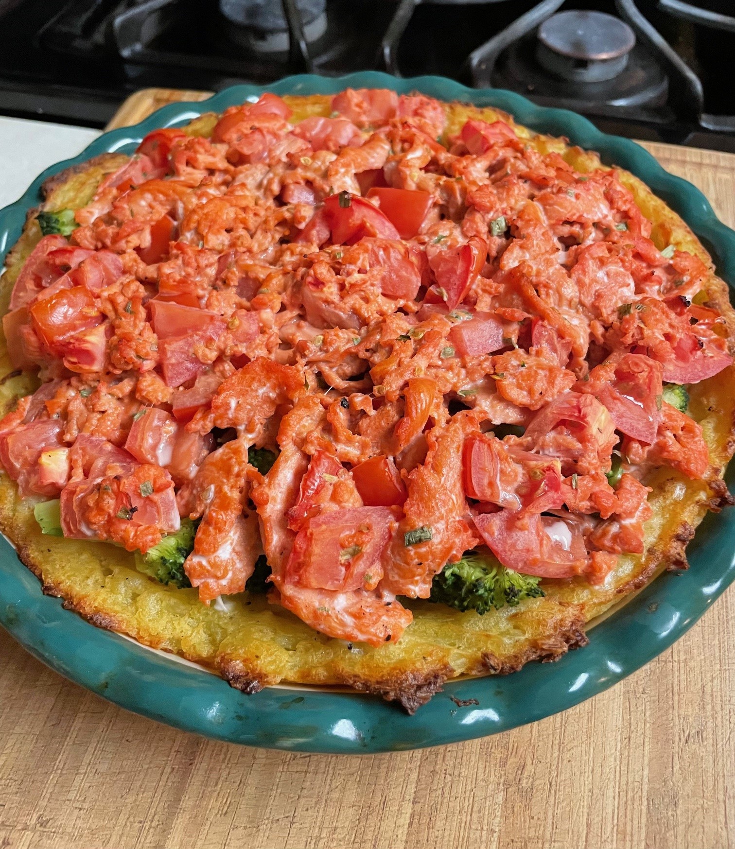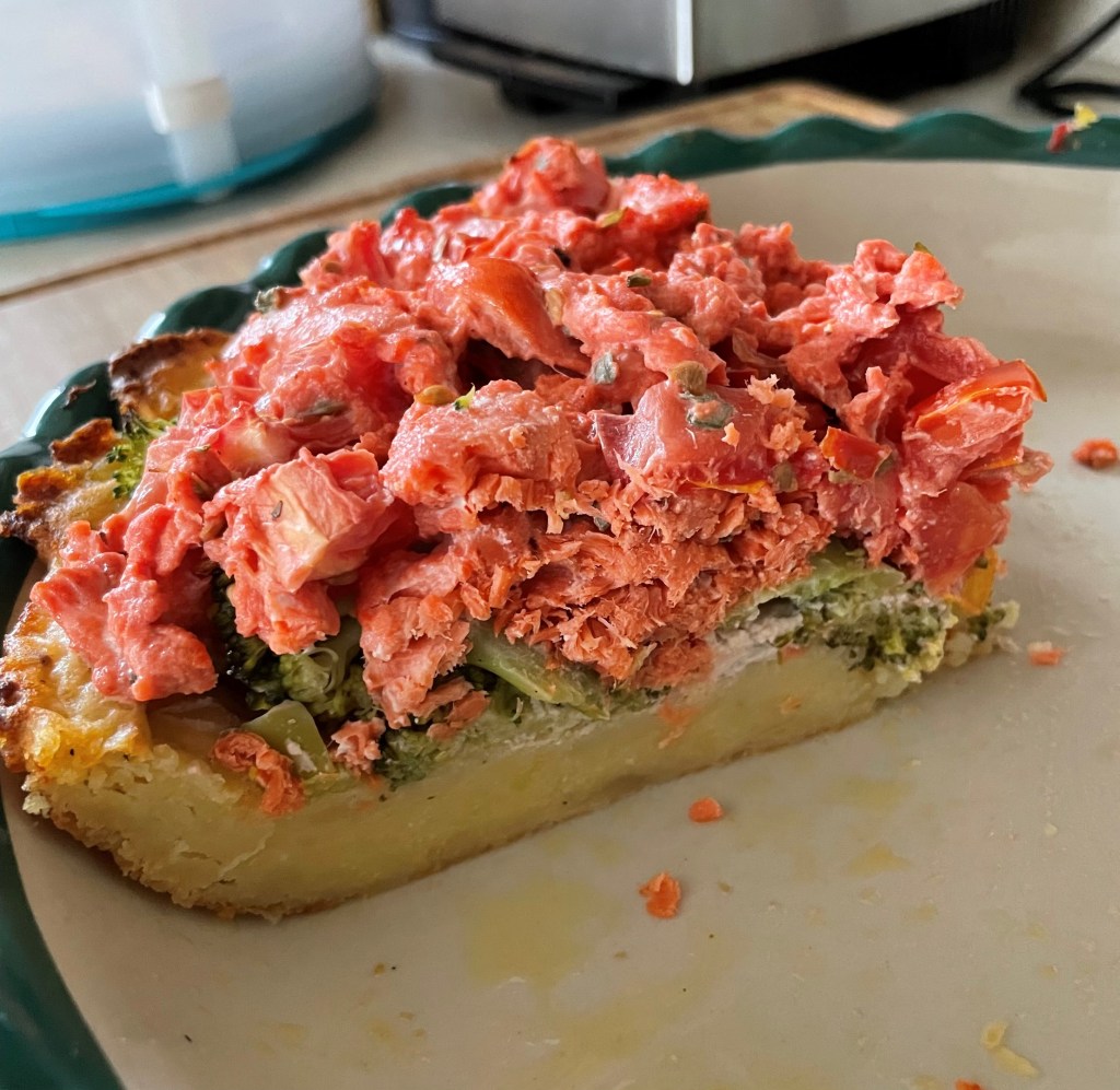 NOTES: This recipe started from Jamie Oliver. I have SO MUCH salmon. I had lightly smoked a salmon filet, but then realized I wasn’t having a dinner party so what would I do with it all. Improvise! I couldn’t really figure out where Jamie Oliver was headed just by reading the recipe, but once I started making this, I was like, “Oh, I get it!” So, that time I used smoked salmon instead of regular. It was already “cooked” instead of raw. I didn’t use any prawns because, well, I have SO MUCH salmon. I get salmon from my friend Sandy, and she had sent me a couple frozen bricks of boneless salmon meat. Another time, I used nearly the whole brick making this. It’s perfect! I didn’t have cherry tomatoes, so I used Romas instead. And on and on it goes. Mixing tartar sauce with mashed potatoes was the real mind-blower, but it’s great! I cannot overstate how flavorful this dish is, a mix of earthy and tart. Try it!
