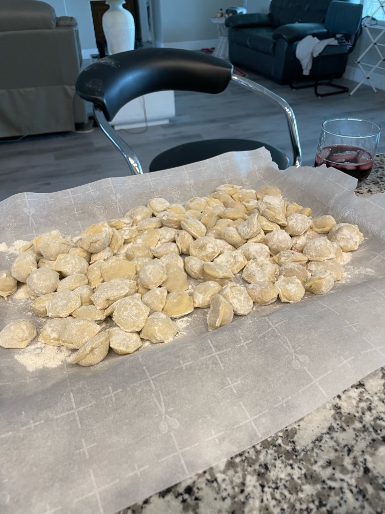 Repeat until all four batches are made. I then used the scraps to make two more batches. That was hard to do. In retrospect I should have added more water to soften the dough scraps and make it easier to roll them out. In any event, we ended up with about 200 pelmeni.
