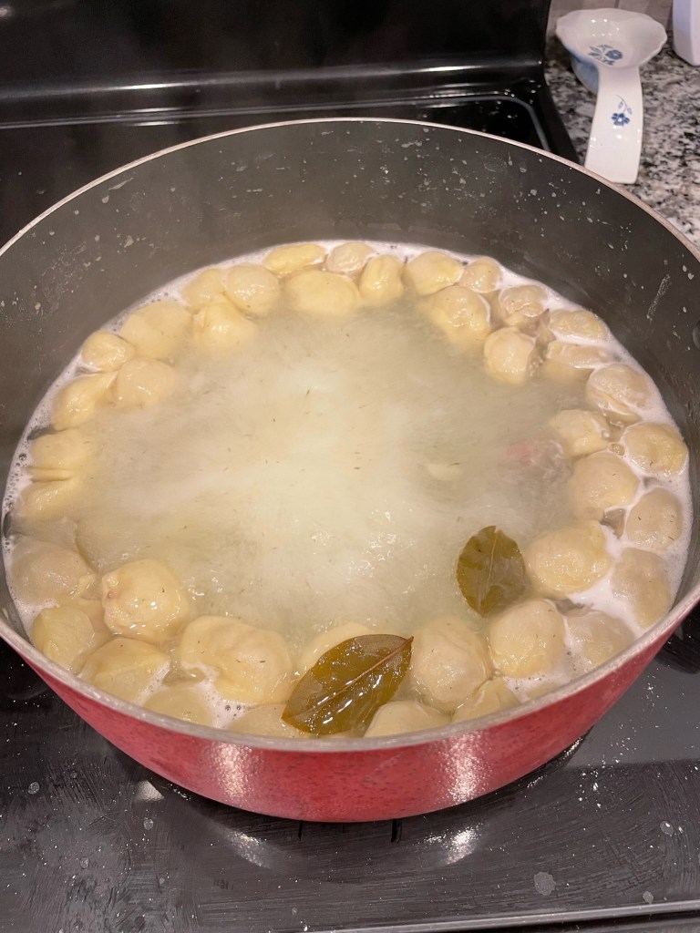 Add bay leaves and dill weed to a pot of salted water and bring it to a boil. We also had one spoonfull of filling left, so we rolled it into a ball and dropped it into the pot for extra flavor. Drop a single layer of pelmeni into the pot. Once it comes back to a boil, let them simmer for ten minutes. Remove with a slotted spoon and serve hot, topped with butter and/or sour cream. Yummy!