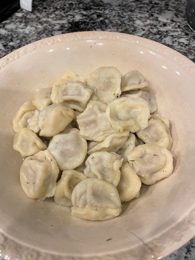 I didn’t really understand how to use the mold, and the packaging is in Cyrillic script (I only know English, so there’s that), so I went to YouTube and found JeffMara Cooking’s video to see how it’s done. The video is awesome and gave me the confidence to proceed. I didn’t use their recipes, just their video how-to guide. For the recipe, I turned to Julia Frey’s Vikalinka. It turned out that her dough to filling ratio was just right. I did my own thing as far as mixing dough and making filling. For this first foray into pelmeni making, I used a meat filling, but we have eaten potato and cheese-filled pelmeni before. Mushroom filling also sounds great. Next time!