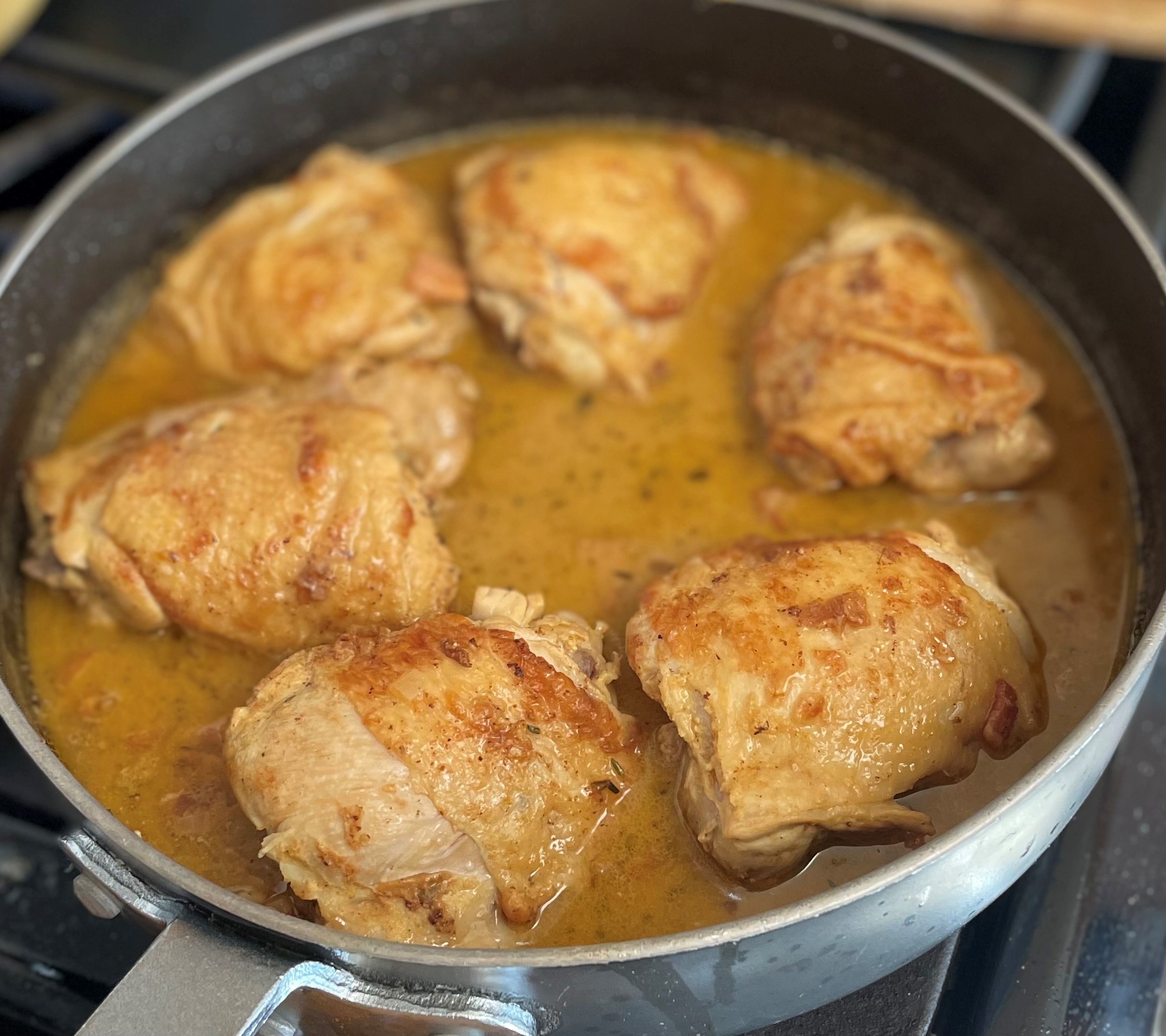 NOTES: I don’t know what it is about this recipe, probably the bacon, but it is super yummy! The recipe originates with Jennifer at Seasons and Supper. She recommends serving with potatoes or pasta. I usually serve this with Twice-baked Cauliflower and a salad. What you see pictured is the recipe using only 6 chicken thighs and, instead of plating it at the end, I put the thighs back into the sauce in my skillet and served it from there. I use Spanish smoked paprika and it’s sublime. I have marinaded the chicken for minutes and for longer than an hour. I’m not sure it makes a difference. There is a lot of fat rendered into the sauce from the chicken. This does not bother me, but it may you.