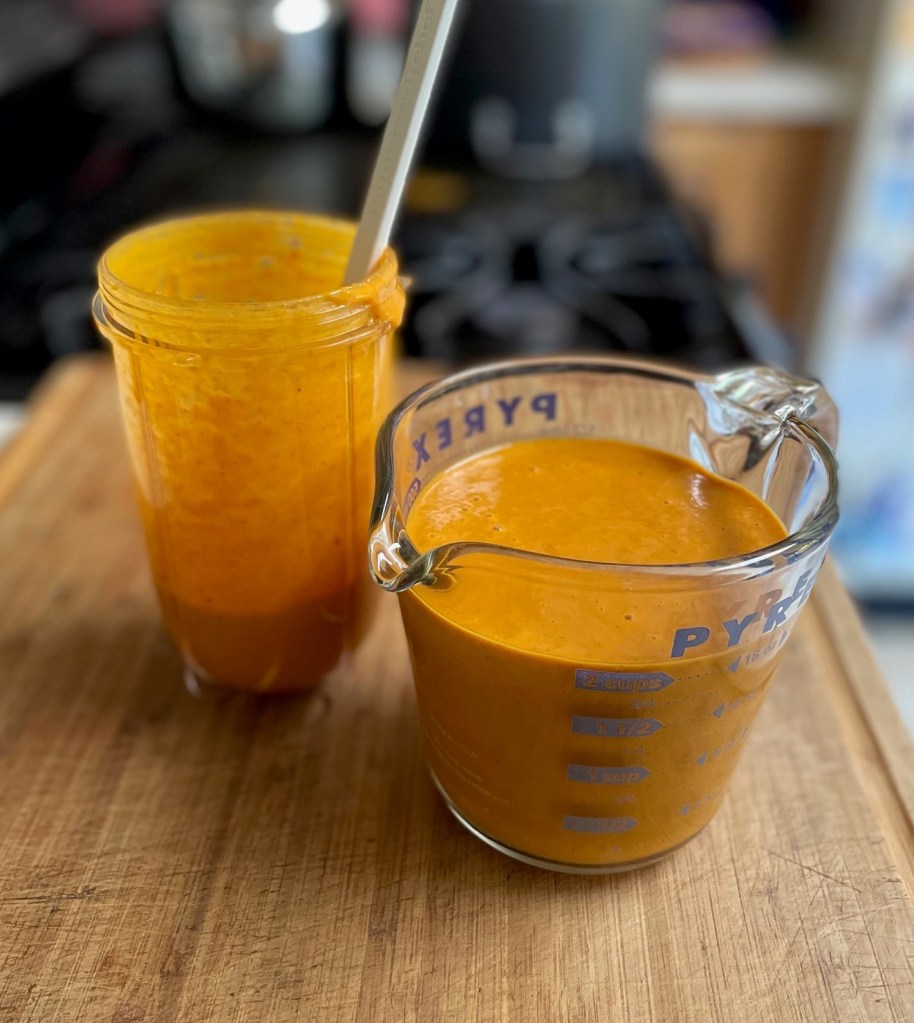 In large sauce pan, melt coconut oil. Stir in onion and stir-fry until soft. Stir in garlic, chili flakes, cumin, and curry powder. Stir over heat until it’s all mixed together and the garlic softens. Stir in tomato puree and coconut milk. Stir in salt. Bring to a boil, reduce heat, and then simmer for 10 minutes. Check the salt and add more, if needed. Remove from heat and let cool. Put the sauce in a blender or food processor and blend until smooth.