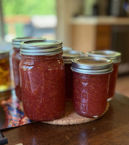NOTE: I do not water-bath can my jam or jelly. There is so much sugar in it that it acts as a natural preservative. Back in the olden days when my mother made jam and jelly, she poured melted paraffin over the top of the jam or jelly, instead of using lids. Paraffin “sealed” the product and kept air from turning the it brown. I have done it that way, too, but find that lids are less muss. I screw the lids onto the jars and turn them upside down for 30 minutes. The heat seals the jars to keep air out. Of course, I only do this with fruit jam and fruit jelly loaded with sugar.