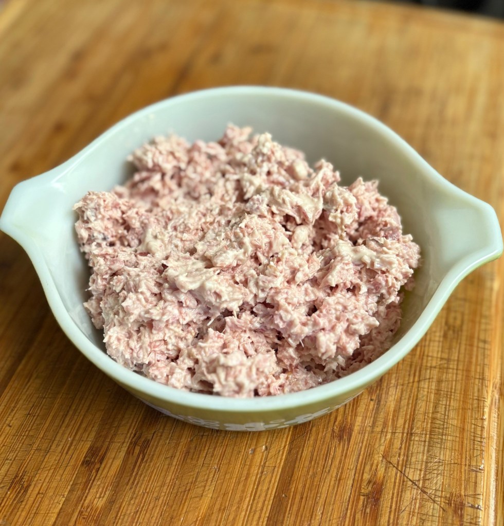 Process ham in a food processor until it’s finely minced. Keep an eye on it, so it doesn’t puree. In a bowl, stir together enough mayonnaise to bind the ham, a dab of Dijon mustard, a splash of hot sauce and Worcestershire, and a spoonful of vinegar. Stir in the ham until it’s well mixed and is the consistency of a spread. Refrigerate for awhile to develop the flavor. Serve. Can be used as a sandwich spread or on crackers or on a bed of lettuce with tomatoes.