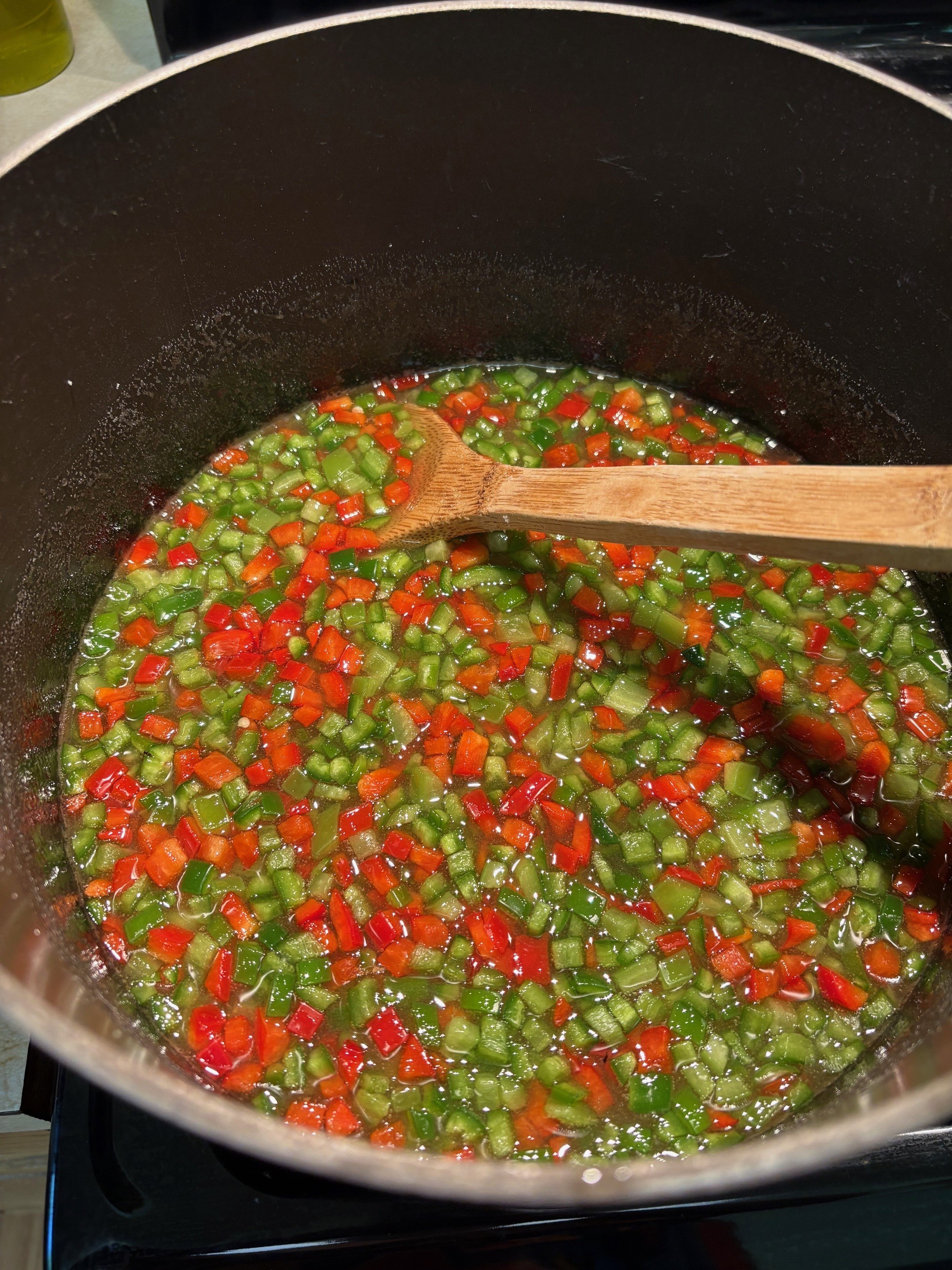 Notes: I didn’t use all 6 of my jalapeno peppers. I realized I was going to have too much “fruit” so I measured as I diced so as not to waste any. If you decide to process the jelly in jars, as it cools you will need to shake it around so that the “fruit” is distributed throughout the jar. Otherwise it floats to the top. I think a jar of this jelly would taste amazing heated in a crockpot with a batch of meatballs or brussels sprouts, or served on crackers with cream cheese.