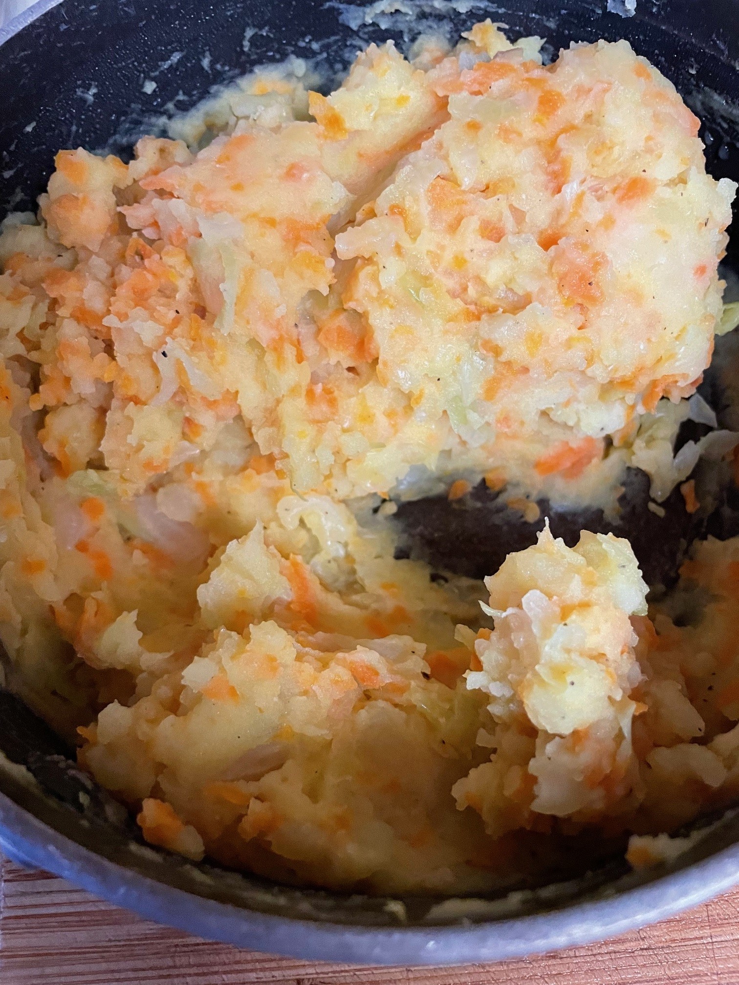 Stir the cabbage and carrot mix into the mashed potatoes and mix together very well. Set aside to cool to room temperature.