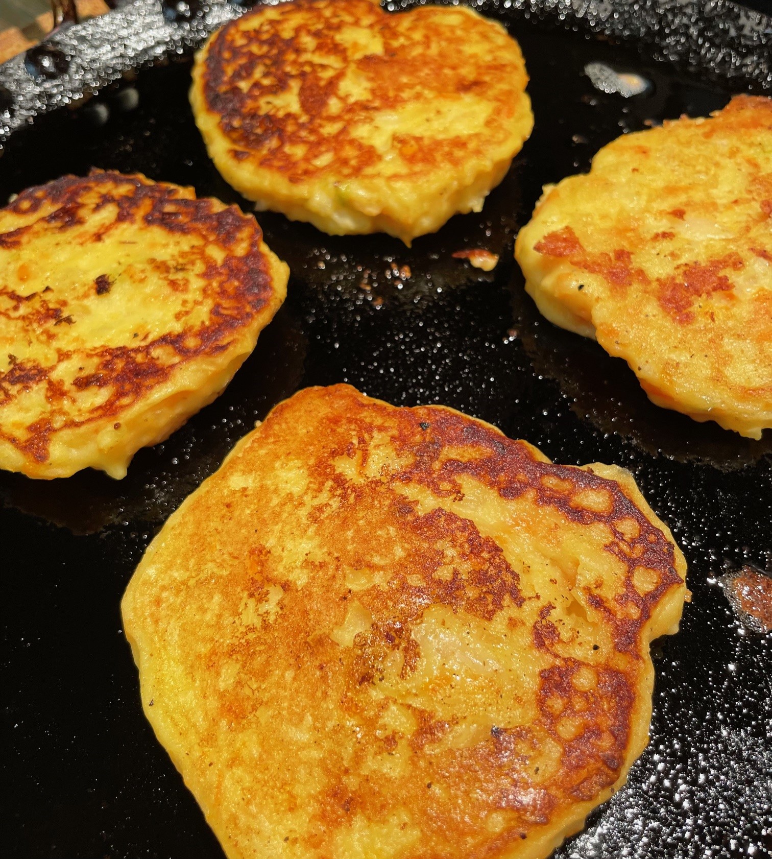 On an oiled medium-hot griddle, dollop about 1/4 cupfuls of mix. Spread the batter around to make the cakes about 1/2″ thick. Once the bottoms are browned, flip over and brown the other side. Make sure the cakes are heated through by using a medium temperature so they don’t get browned too quickly. Yield is about a dozen cakes.