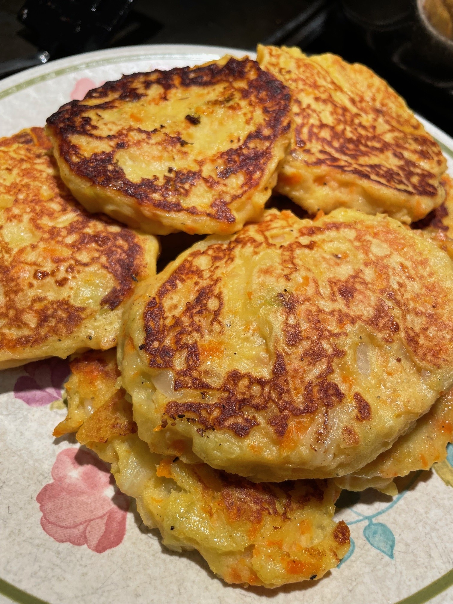 NOTE: These are an excellent side dish for roast chicken or beef stew. I had leftover potatoes, cabbage, and carrots from a corned beef dinner one St. Patrick’s Day and I made these cakes the next day. Wow! They are really tasty. Another time, I added scallions. I suppose you could jazz them up with any number of vegetables or flavorings. In the photos, I used rendered chicken fat/butter to fry my cakes. I had browned a whole chicken in butter and instead of discarding the fat, I fried the cakes in it. These could be made gluten-free by using gluten-free flour instead of regular flour. The dish isn’t at all fussy, so do what you want! I also like these leftover cakes served with eggs for breakfast.