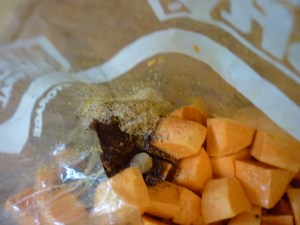 In a large resealable plastic bag, toss sweet potatoes and oil. Add remaining ingredients; toss to coat. Transfer to a greased 11×7” baking dish. Bake, uncovered, at 400 degrees for 40-45 minutes or until sweet potatoes are tender, stirring every 15 minutes. Yield 8 servings.