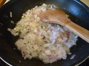 In the same pan, stir 1/8# (3-4 slices) chopped bacon over medium heat until lightly browned, about 5 minutes. Discard fat, if any. Add 1/2 small onion and 1 clove garlic; stir and cook until onion is limp, about 5 minutes.