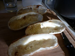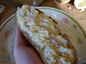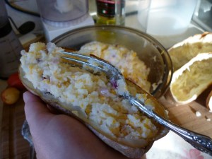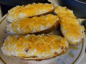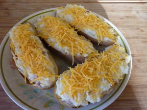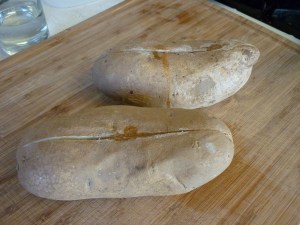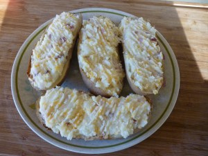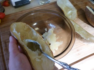 Start by washing russet “baker” potatoes and running a knife lengthwise along one side of each, just piercing the skin. Then give one deep jab along the score. One time I didn’t do this and had the potatoes explode in the oven and make a mess, so do it. Just sayin’. The russets I use are quite large and I bake at 350 degrees for an hour and a half. They should be soft when squeezed. Remove from the oven and let cool awhile, until you can pick them up. It’s much easier to scoop out the insides if they are still warm. This is what they look like when cooked.