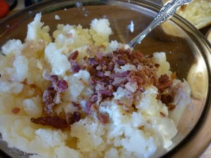 Add the shallot, garlic, butter mixture to the potatoes. Add salt and pepper. Add a few tablespoons of bacon bits. Stir together with dollops of sour cream, enough to bind it all together.