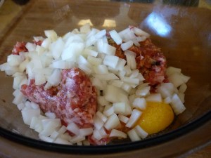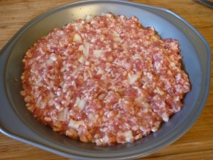 Mix together 1-1/2 pounds lean ground pork, 1 chopped onion, 2 eggs, ¼ tsp. cayenne, ¼ tsp. sage, 2 Tbsp. Worchestershire sauce, Salt and pepper.