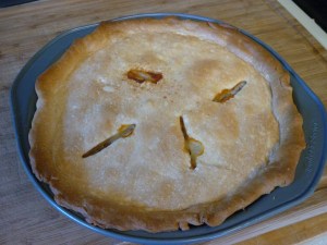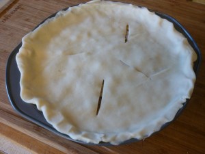 Mix everything, except crust, together and place into a greased 8” pie pan. Bake, covered, in a preheated oven at 375 degrees for 30 minutes. Remove from heat and drain off accumulated fat. Cover with crust and return to oven for 45 minutes or until the crust is brown and flaky. Allow to cool completely before serving.