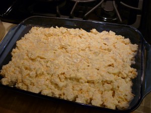 This is super simple and makes an excellent snack or dinner component when you want to have something already prepared and sitting in the refrigerator. The recipe is based upon one found in The Frugal Gourmet On Our Immigrant Ancestors (William Morrow 1990) by Jeff Smith. Smith says it is a Welsh dish. I’ve made this many times and I like the idea of eating it by hand on-the-go. Today I really didn’t pay much attention to measurements, just threw the ingredients in. I forgot to cover the dish for the first part of baking and it did come out a bit dry in the end. My ground pork was quite lean and I did not have but a tablespoon of accumulated fat to pour off.